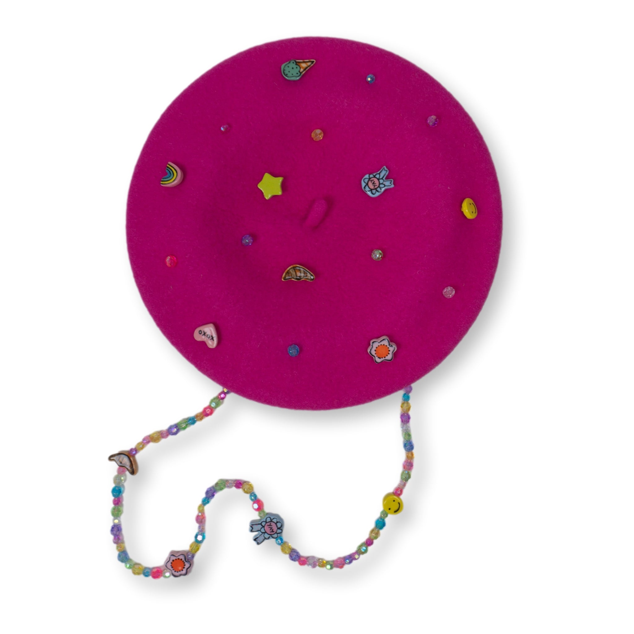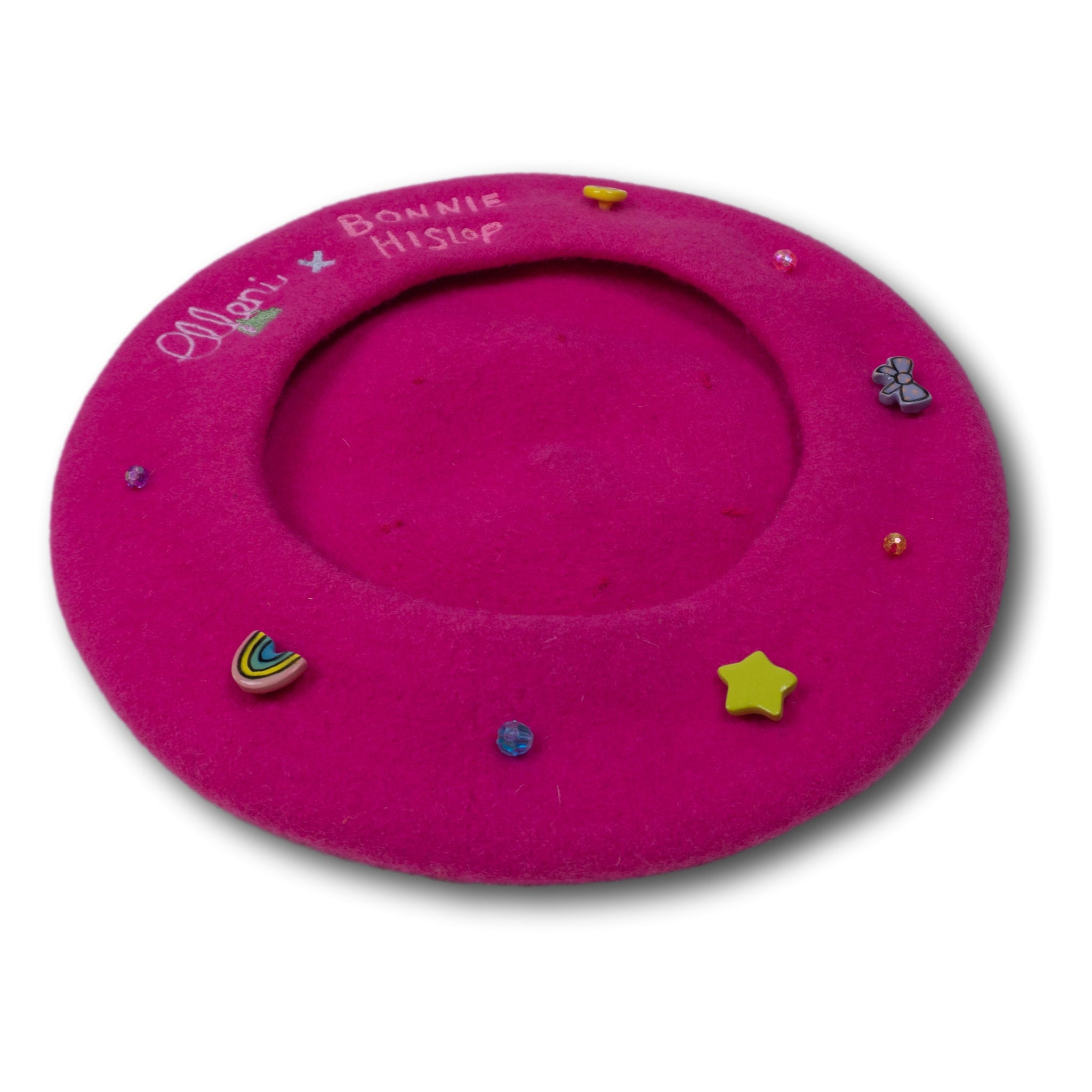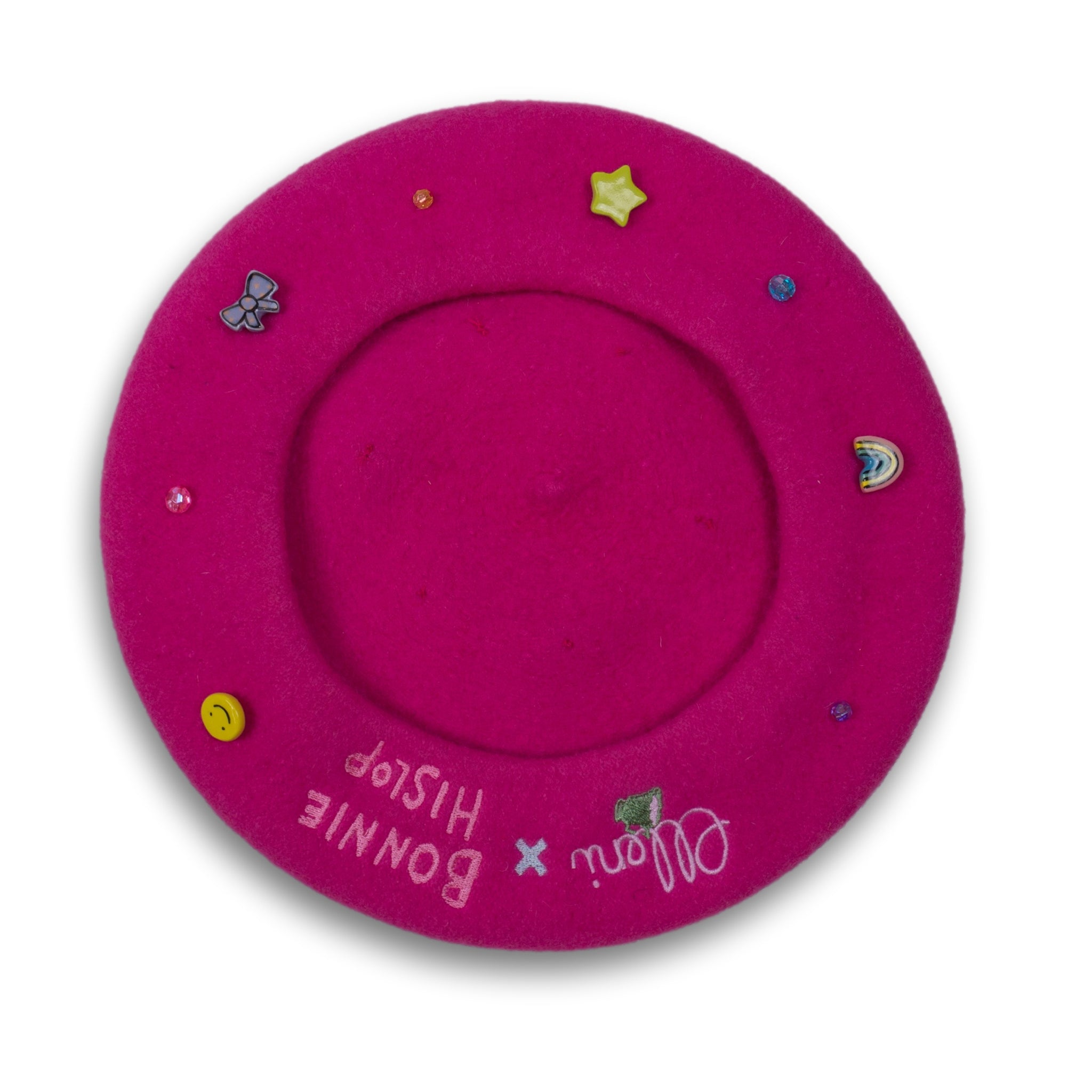 Every beret will include at least one of every style of Bonnie Hislop exclusive beads (bow, rainbow, prize ribbon, croissant, heart, flower, smiley, star and ice cream) but double ups and placements will vary. And some lucky darlin's may receive an extra, secret bead - not pictured!