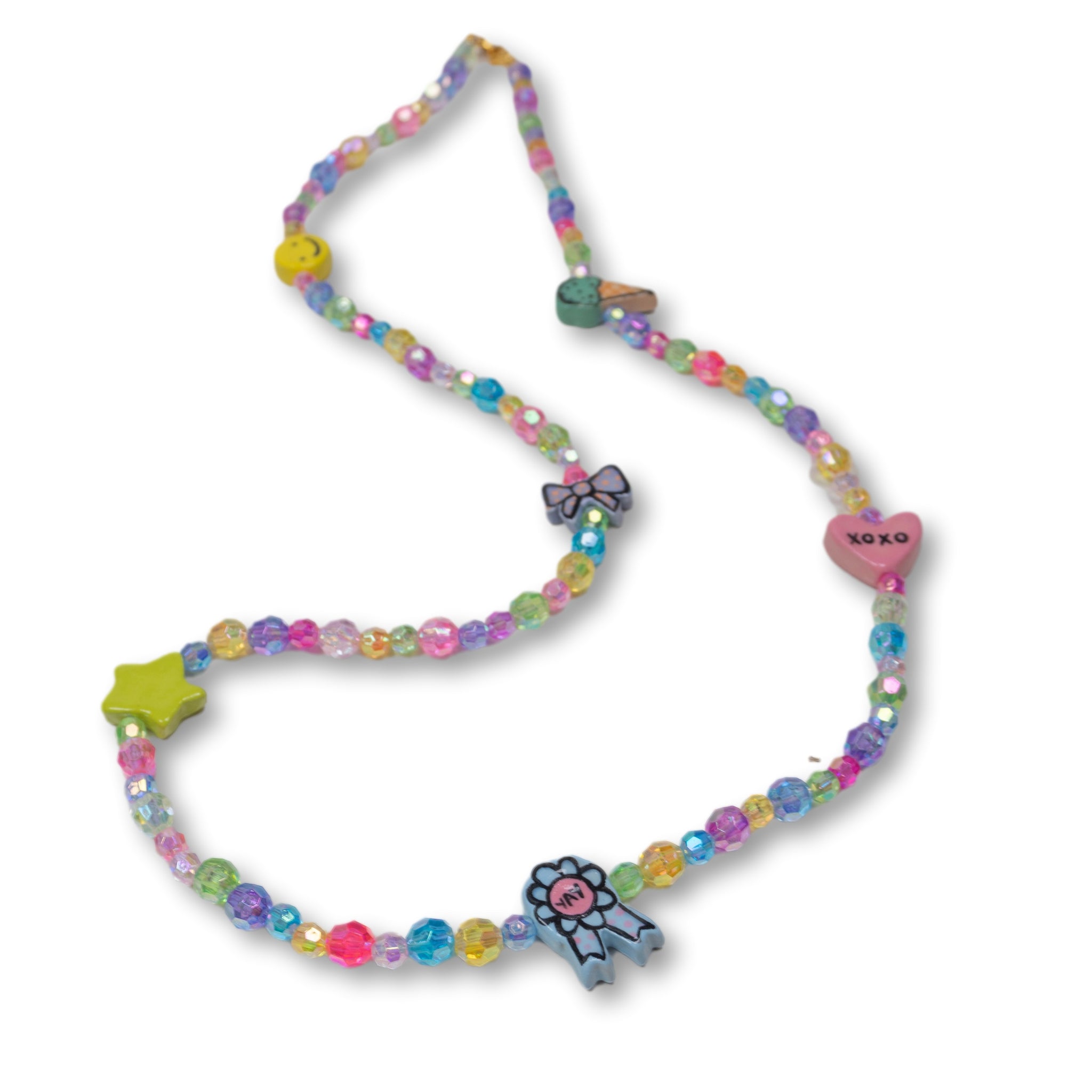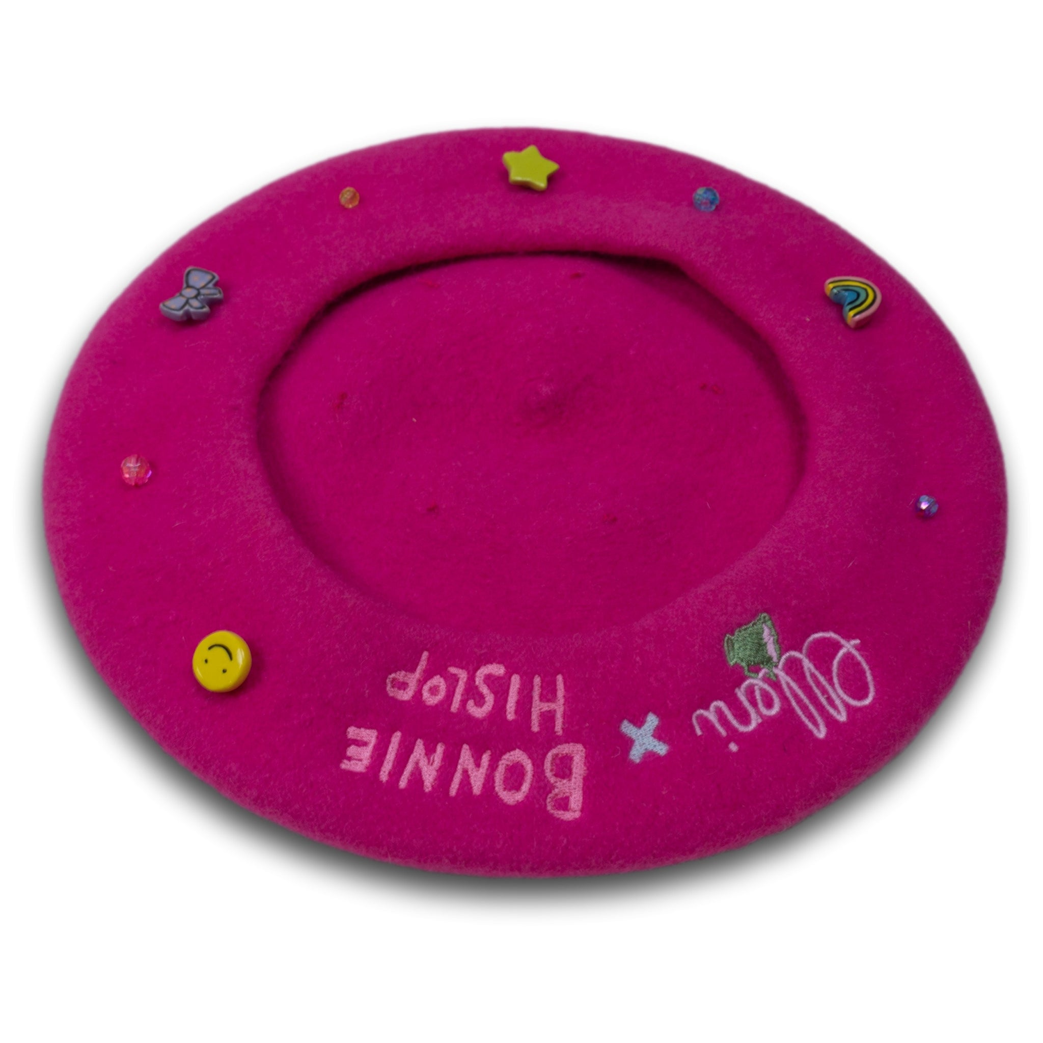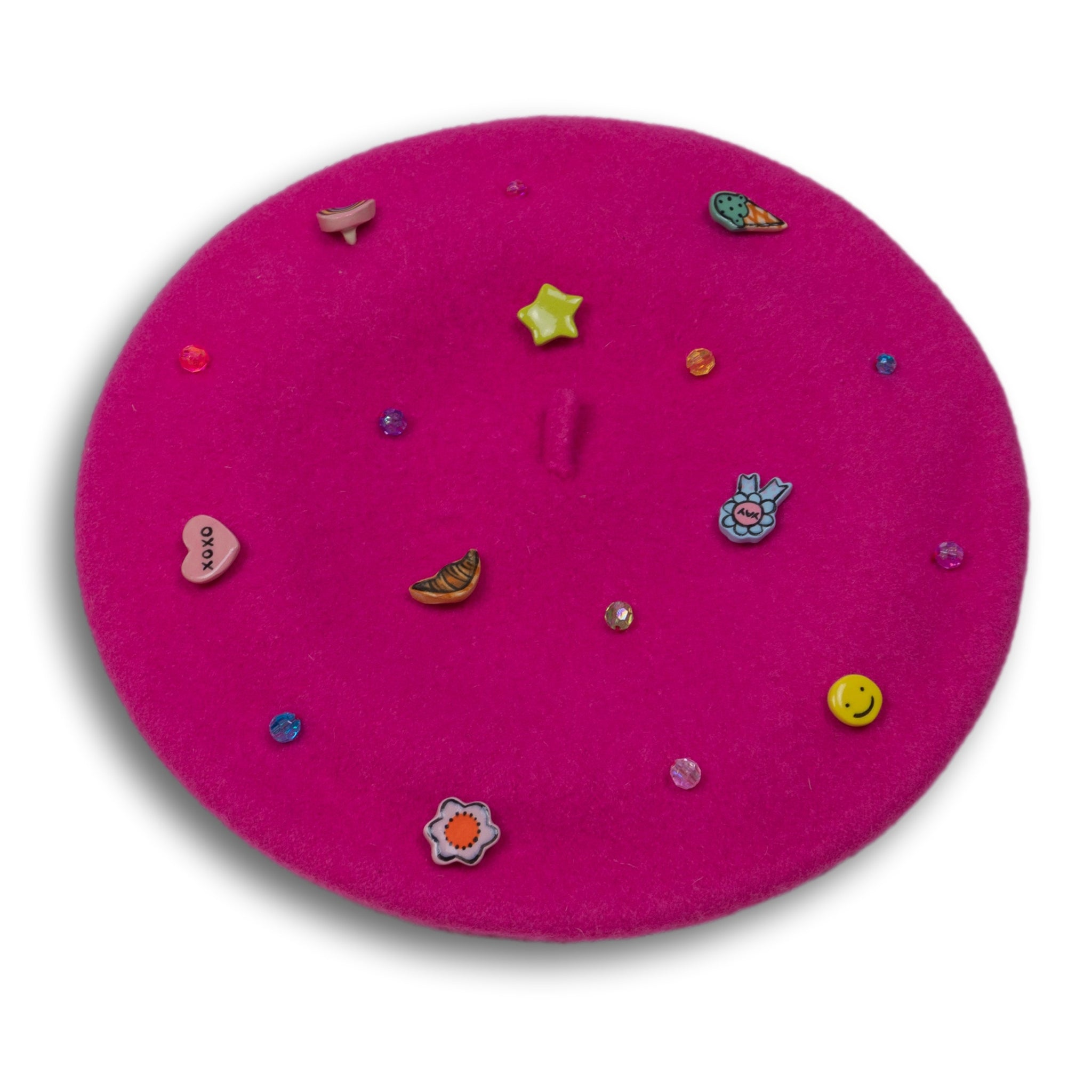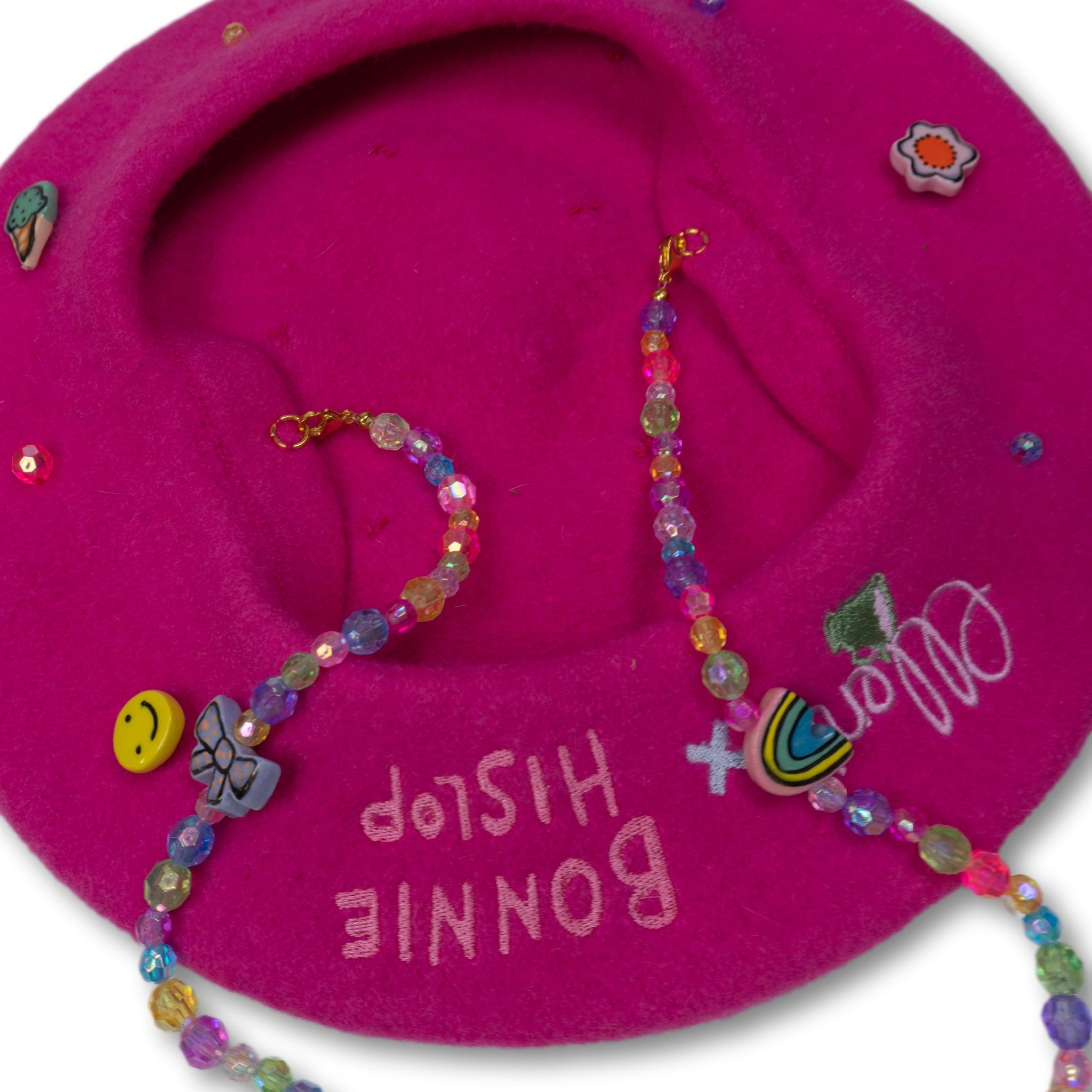 Every beret will include at least one of every style of Bonnie Hislop exclusive beads (bow, rainbow, prize ribbon, croissant, heart, flower, smiley, star and ice cream) but double ups and placements will vary. And some lucky darlin's may receive an extra, secret bead - not pictured!