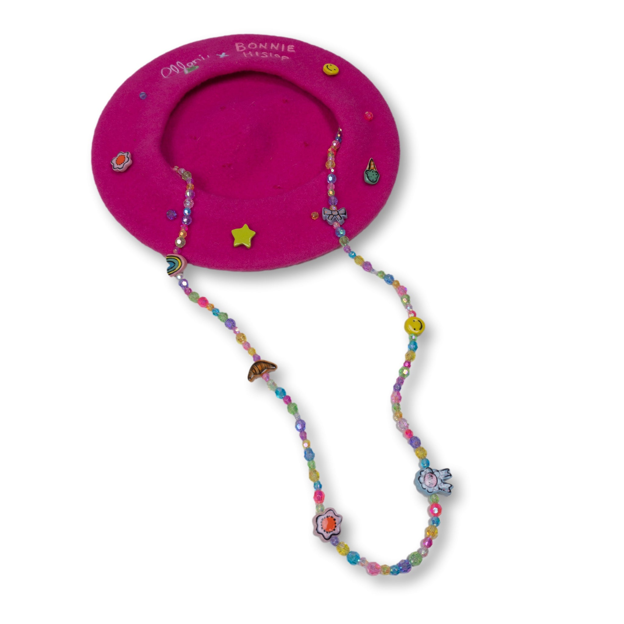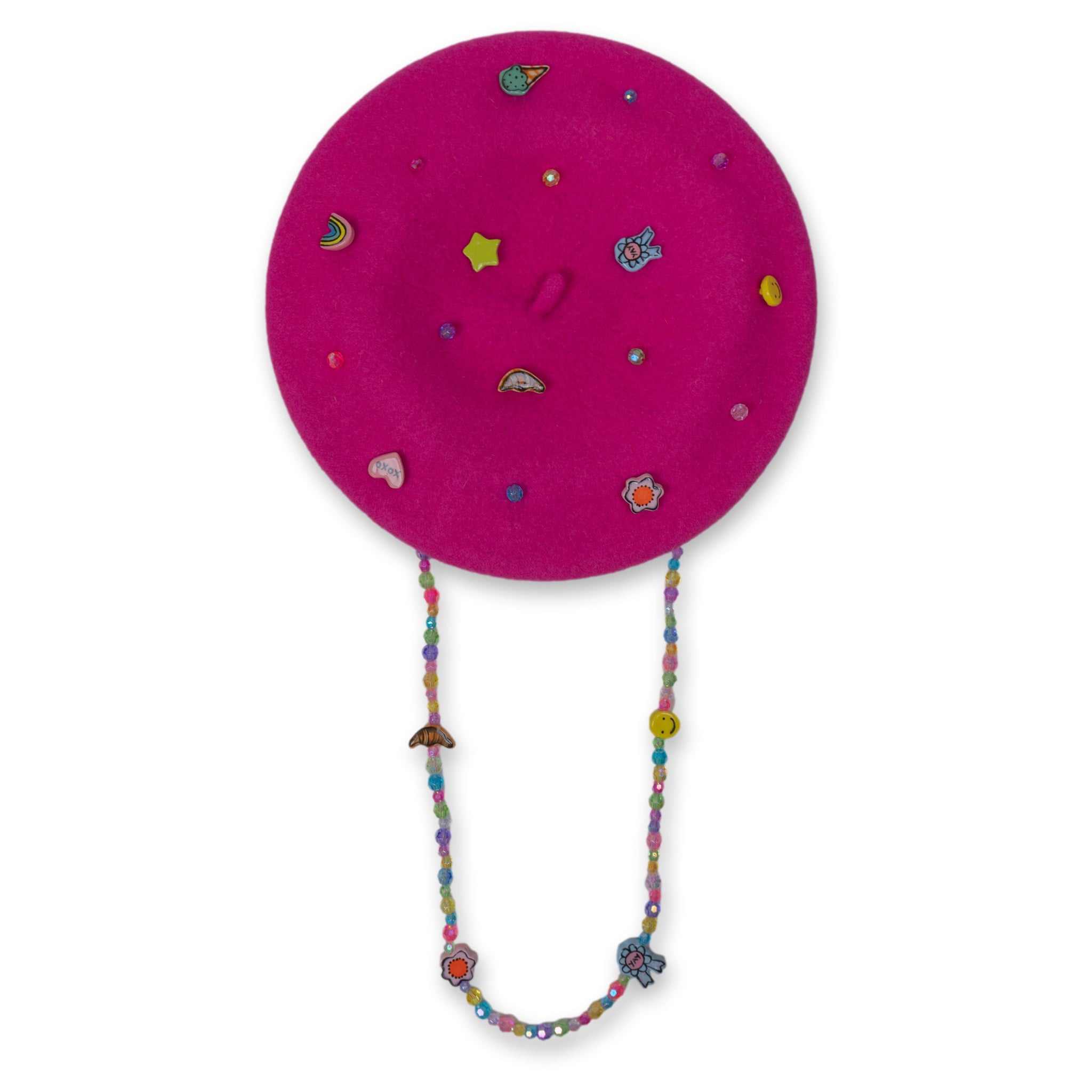 What's even sweeter than a Pick 'n' Mix? A Bonnie Hislop x Elleni the Label collab! The Pick 'n' Mix Beret Beret features handmade Bonnie Hislop ceramic beads adorning a magenta pink beret base, on both the top and rim. Sprinkled throughout are shimmery AB rainbow beads in two sizes.