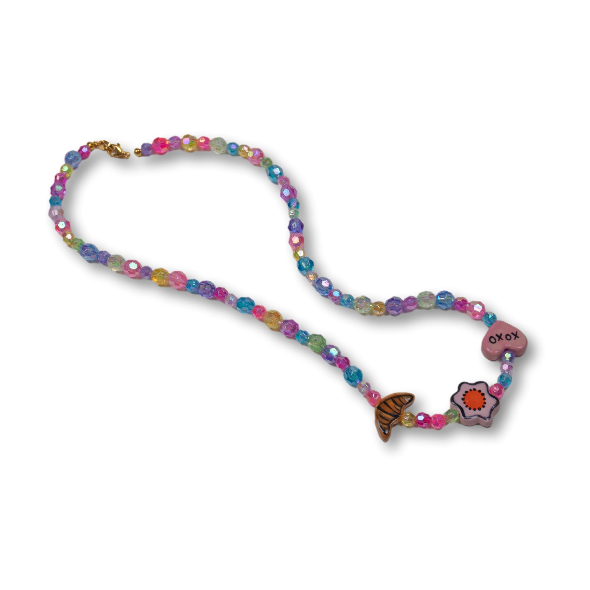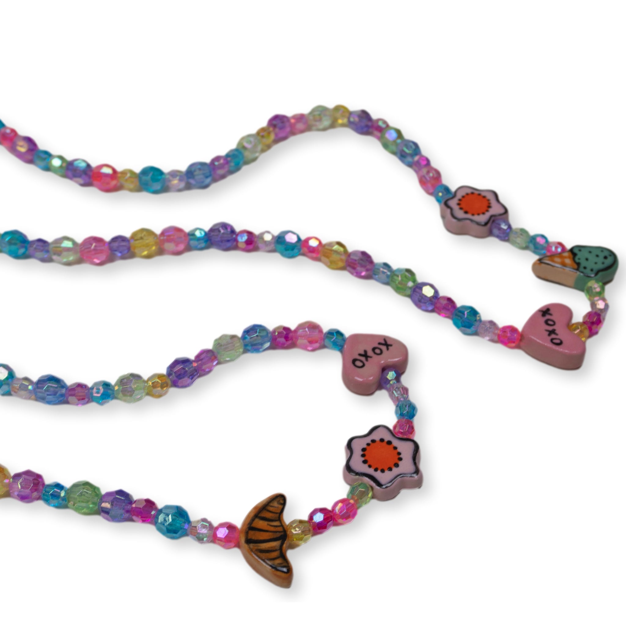 The Pick 'n' Mix Necklace features alternating sizes of shimmery multi coloured AB beads with 3 different, randomised Bonnie Hislop handmade ceramic beads in the centre. Note: each necklace will feature 3 different ceramic beads, but could be any of the 9 included in the collection. (bow, rainbow, prize ribbon, croissant, heart, flower, smiley, star and ice cream)