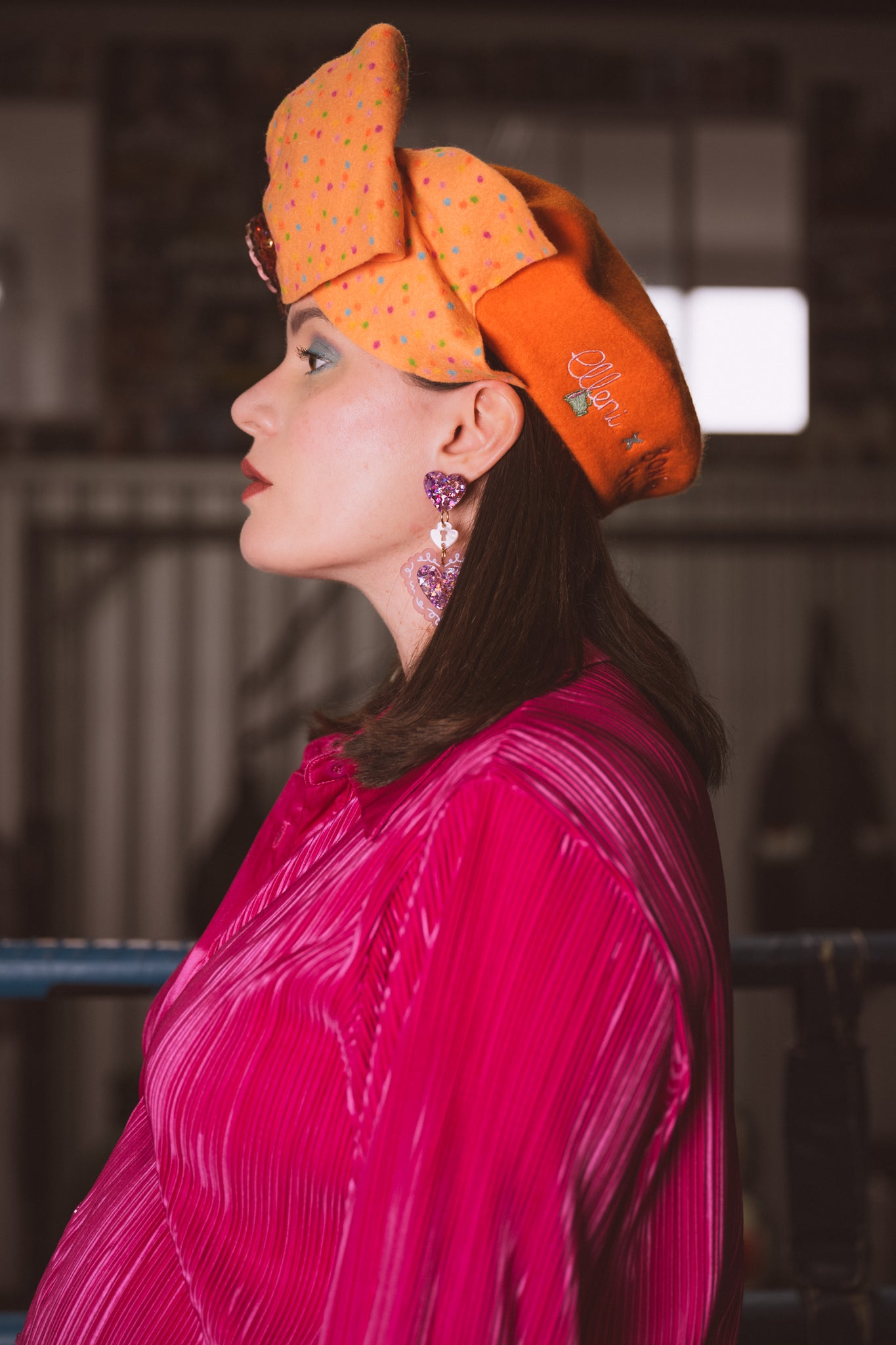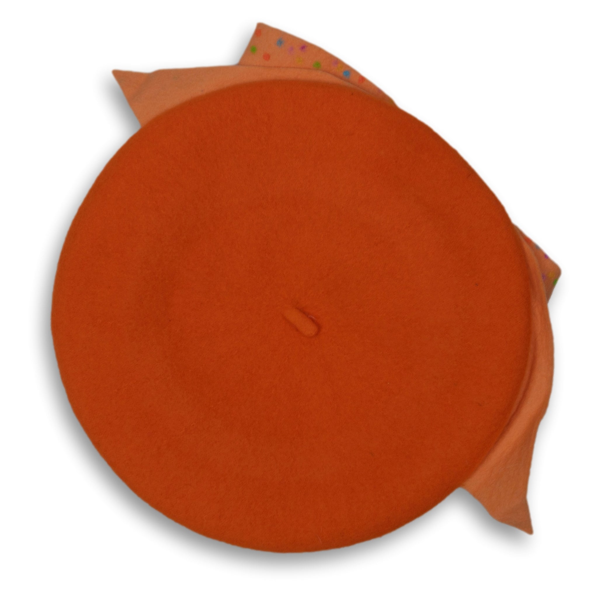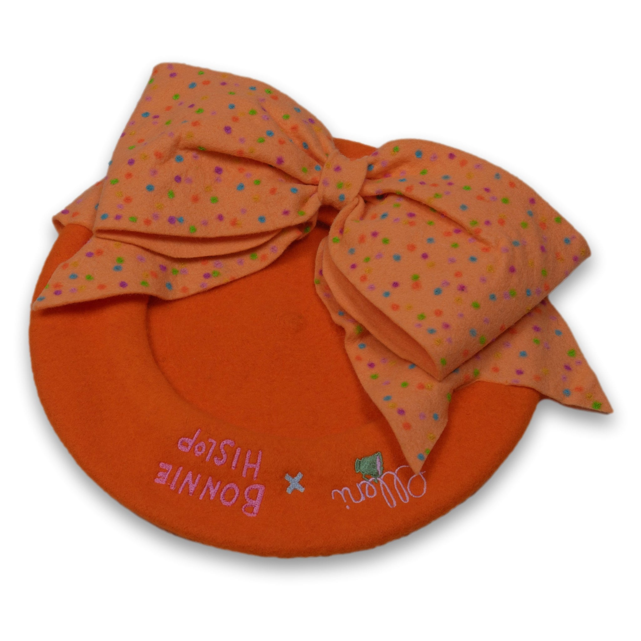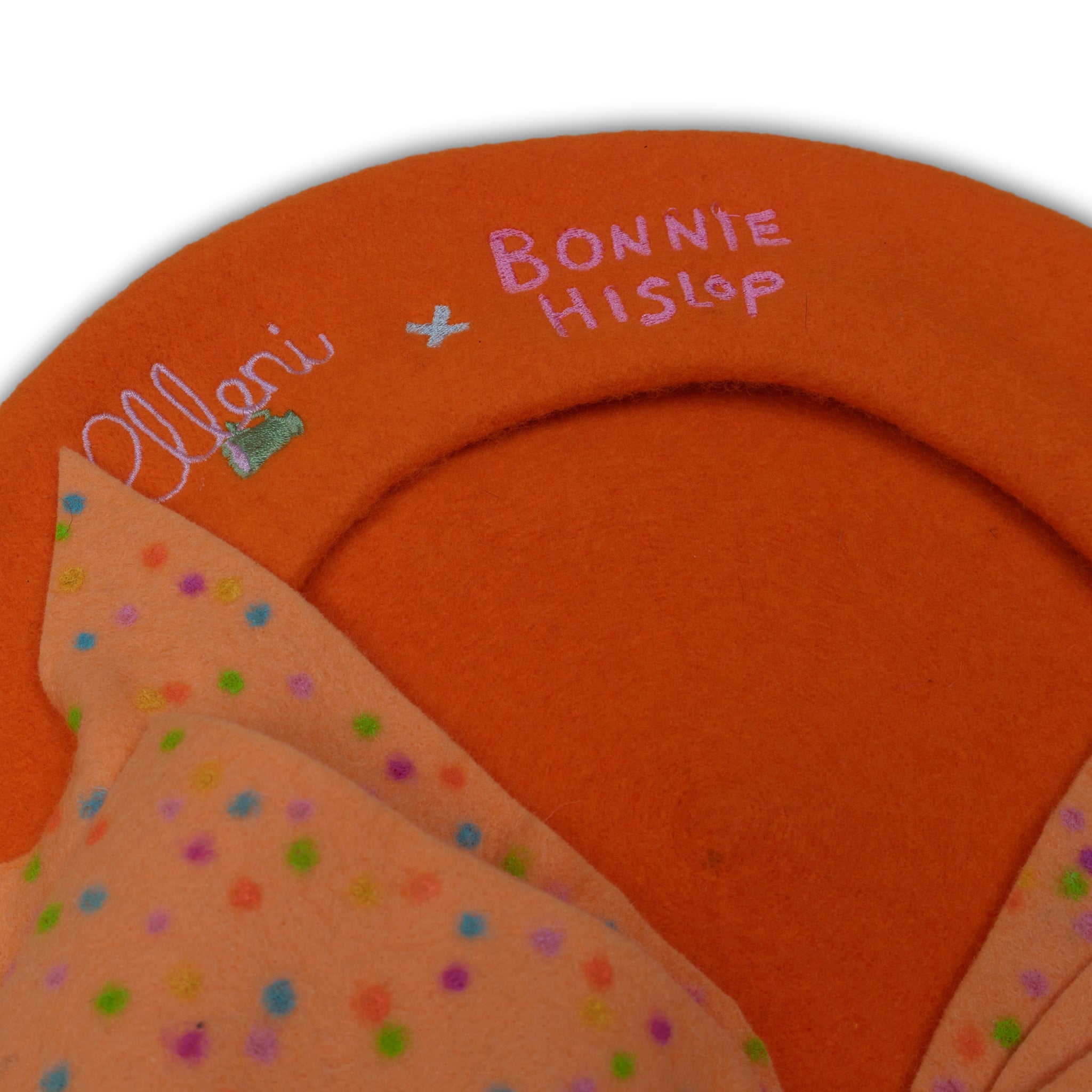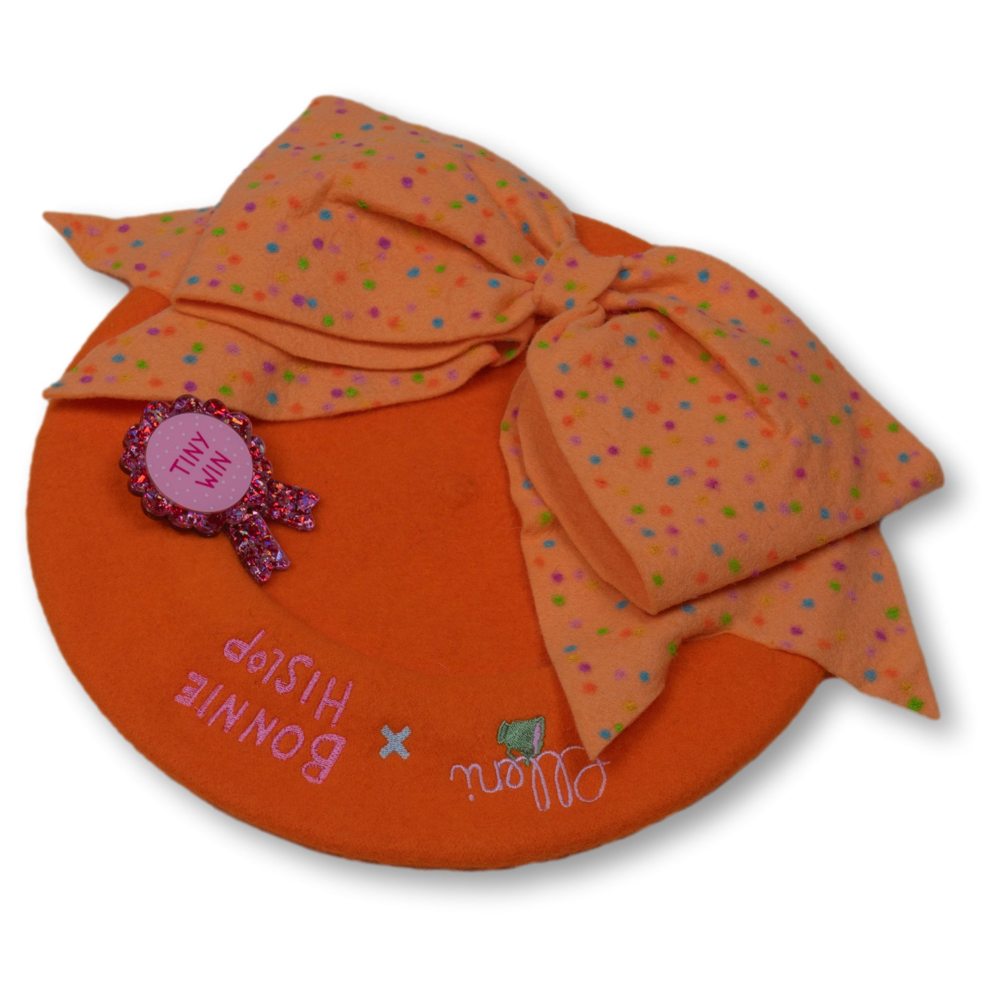 Some days are Tiny Win days and some are Big Bow days - the Tiny Wins and Big Bows Beret is for both! On an orange beret base, the biggest of felted bows adorns the rim, completely littered in multi coloured polka dots, hand painted by Bonnie Hislop - mirroring her hand painted ceramics.