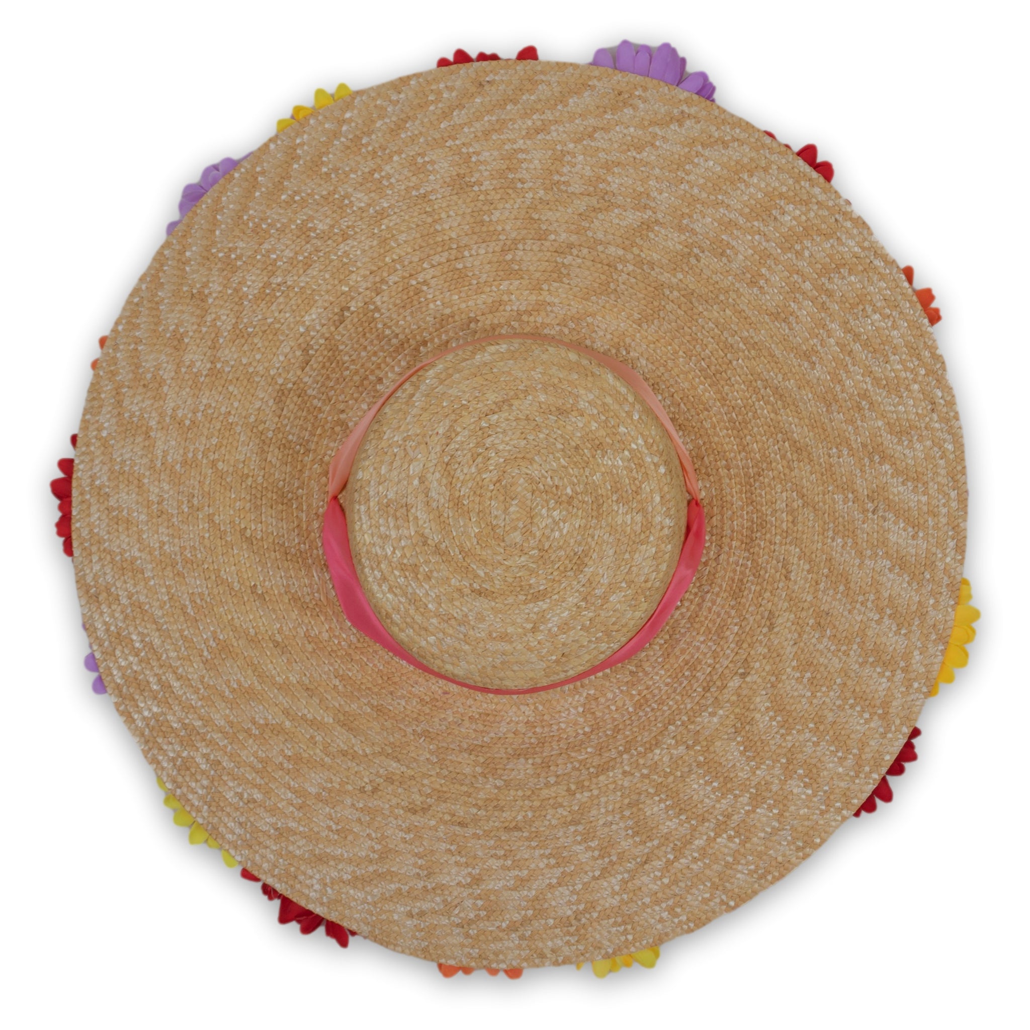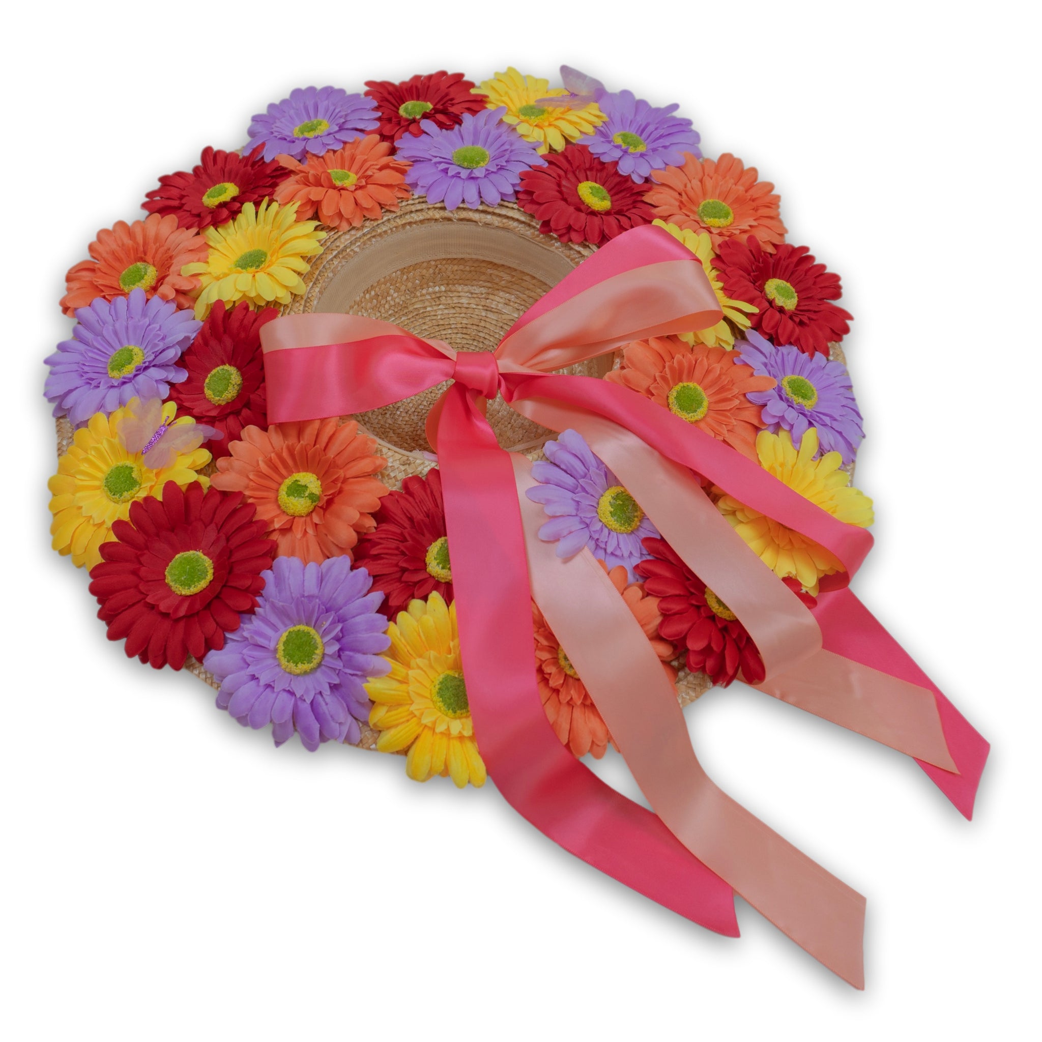 This broad 15cm brimmed straw hat measures approx. 49cm in diameter with the underside completely covered in silk Gerberas in a sunset display of purple, red, yellow and orange. Two purple organza winged butterflies can be seen enjoying the garden that is your head! Two satin ribbons are threaded through the hat in peach and watermelon colours, allowing you to secure the hat to your head.