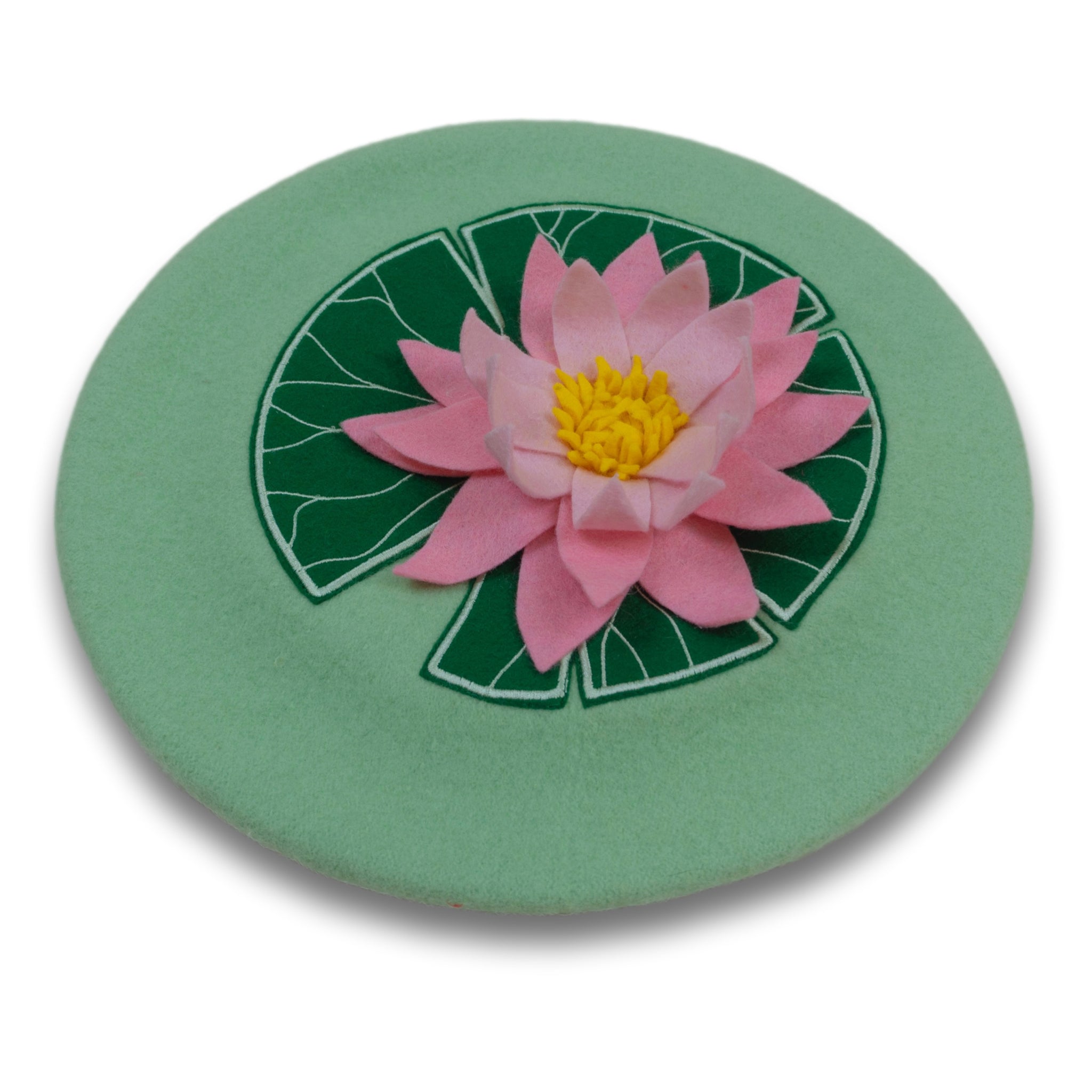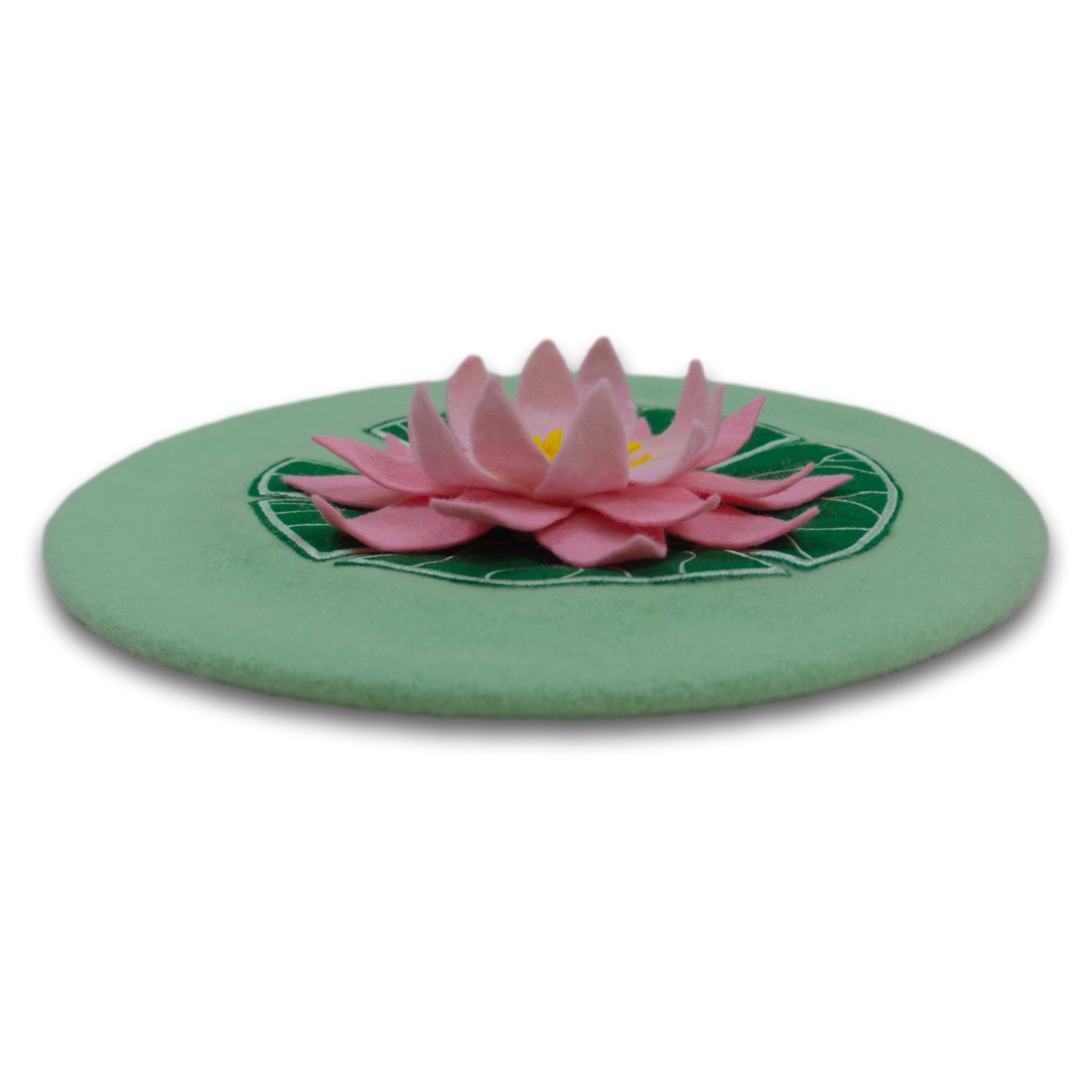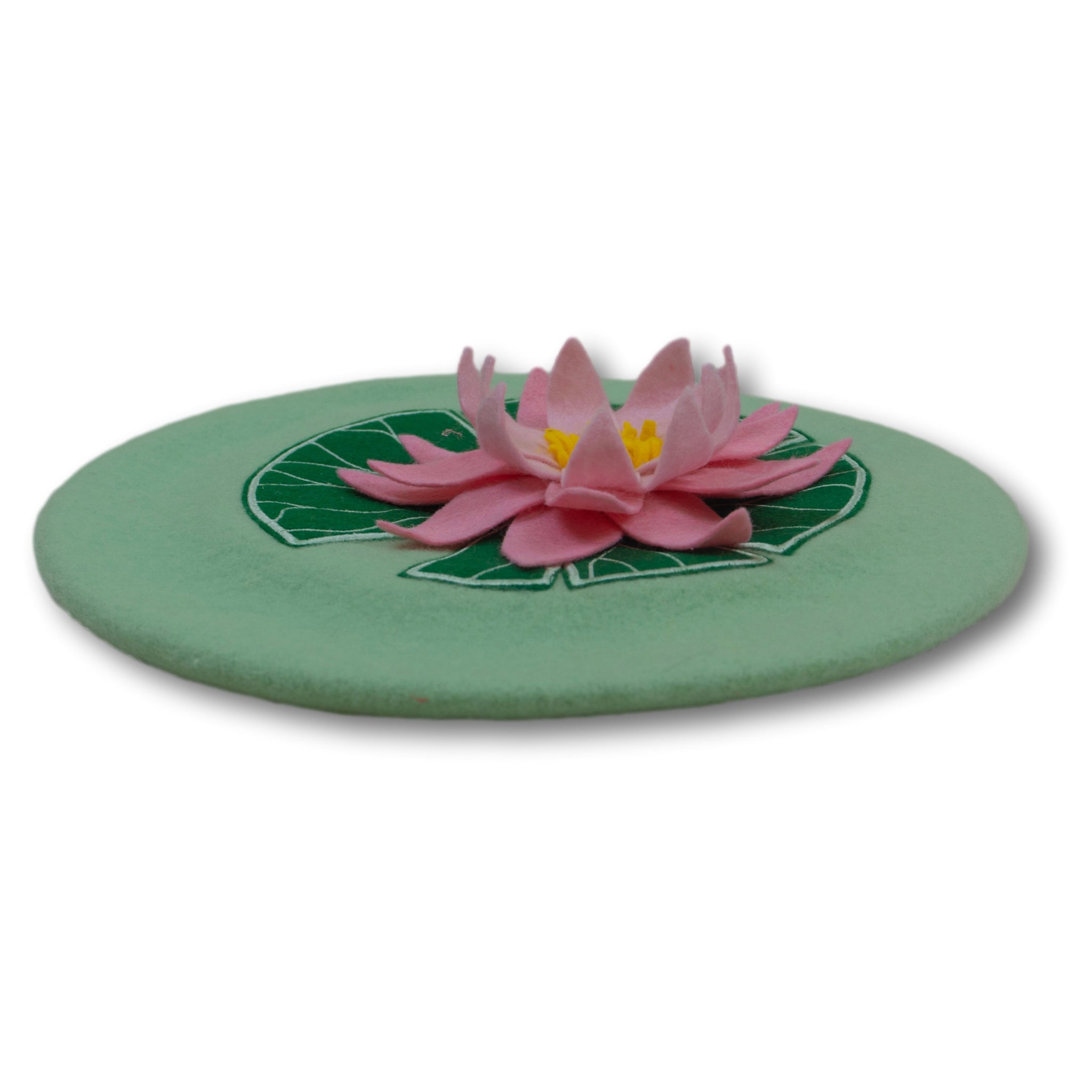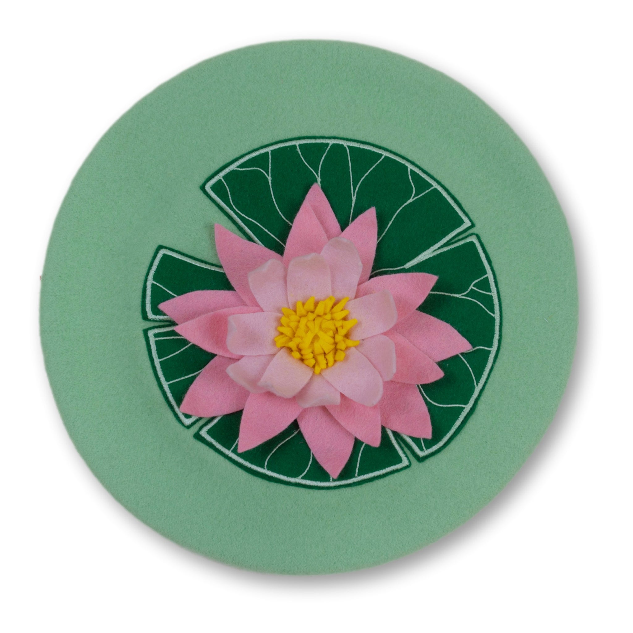The Lillie (Lily Pad Beret) features a mint green beret base, topped with a felted Lily Pad in a darker shade of green, with embroidery detailing. Atop, lives a felted water lily in two pink tones ensuring you're the prettiest flower in the pond.