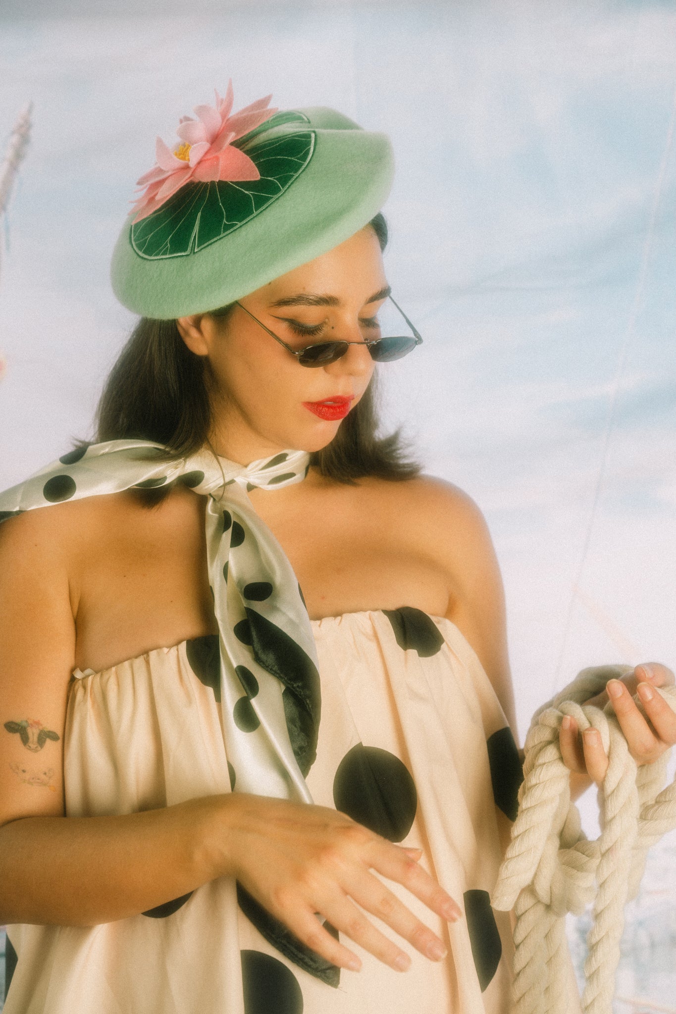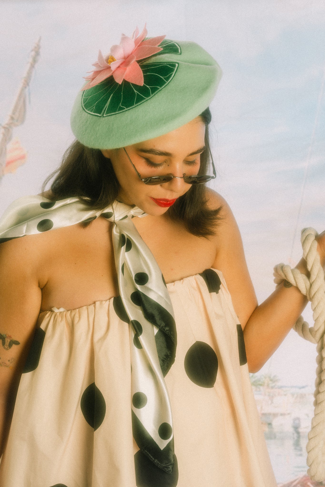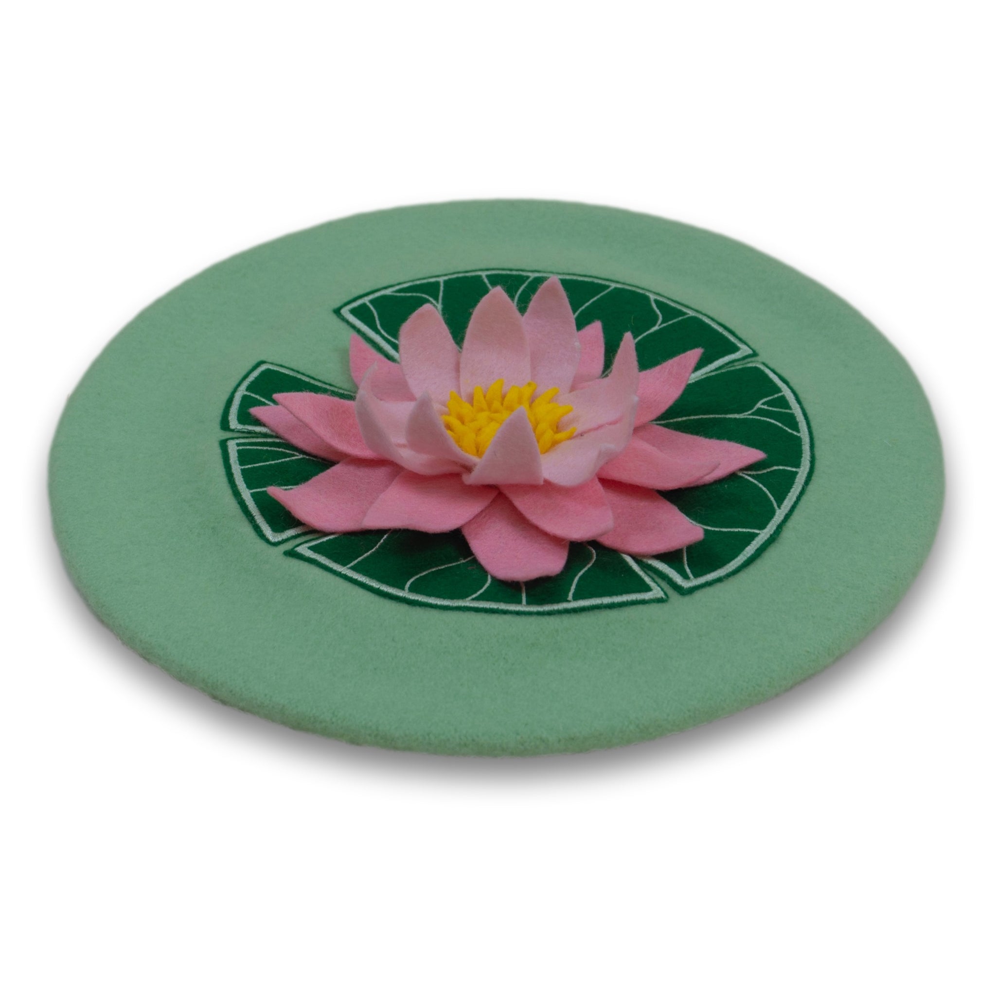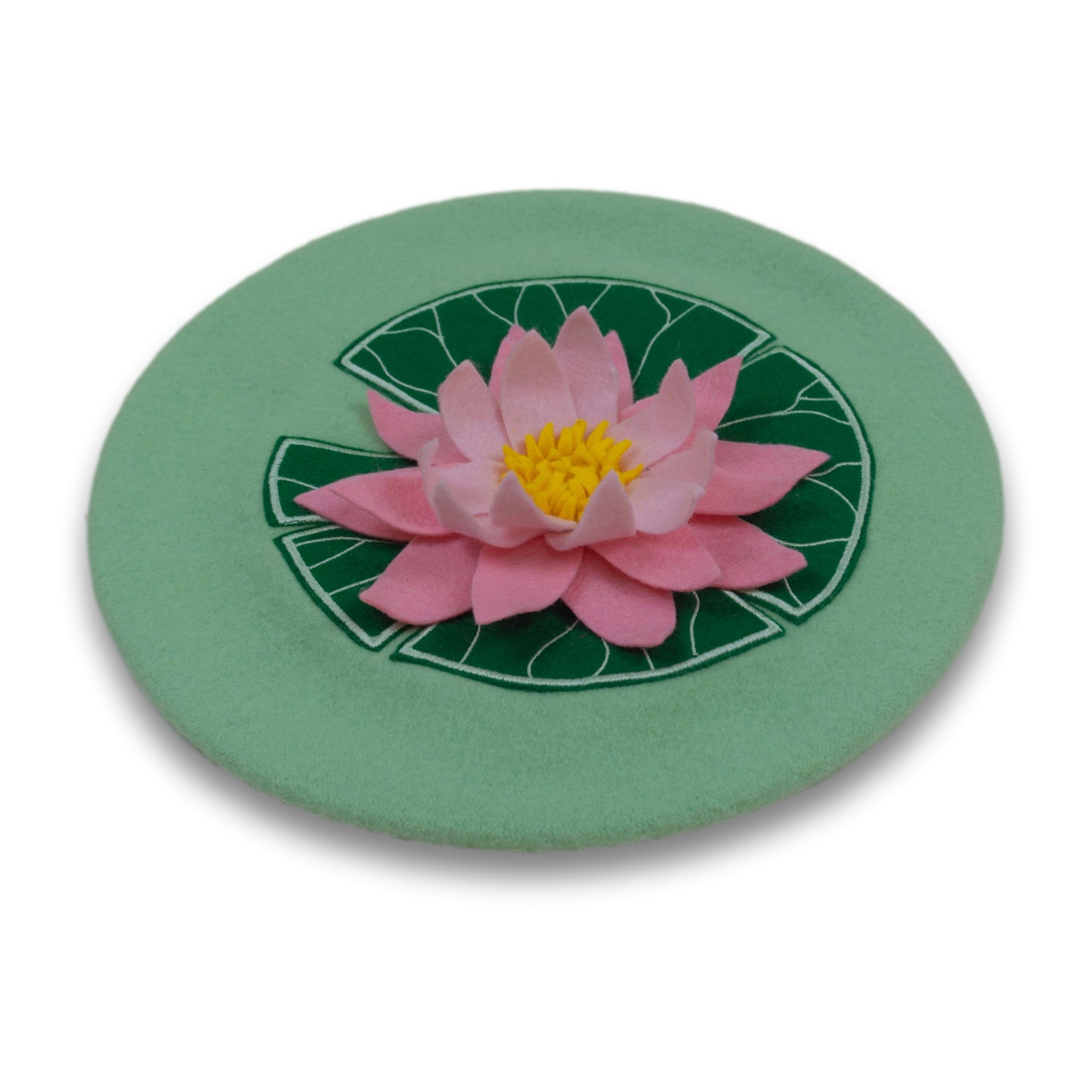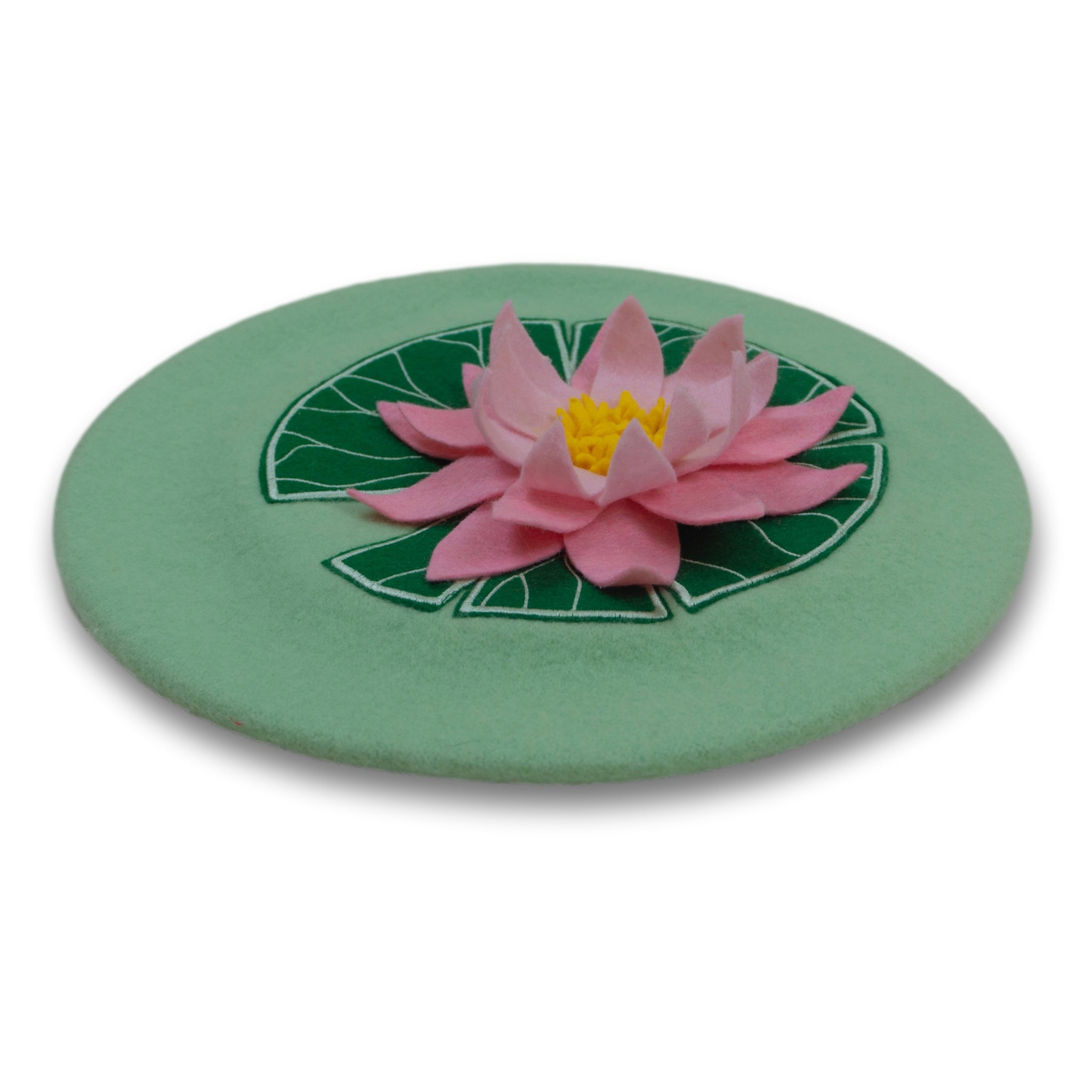 The Lillie (Lily Pad Beret) features a mint green beret base, topped with a felted Lily Pad in a darker shade of green, with embroidery detailing. Atop, lives a felted water lily in two pink tones ensuring you're the prettiest flower in the pond.