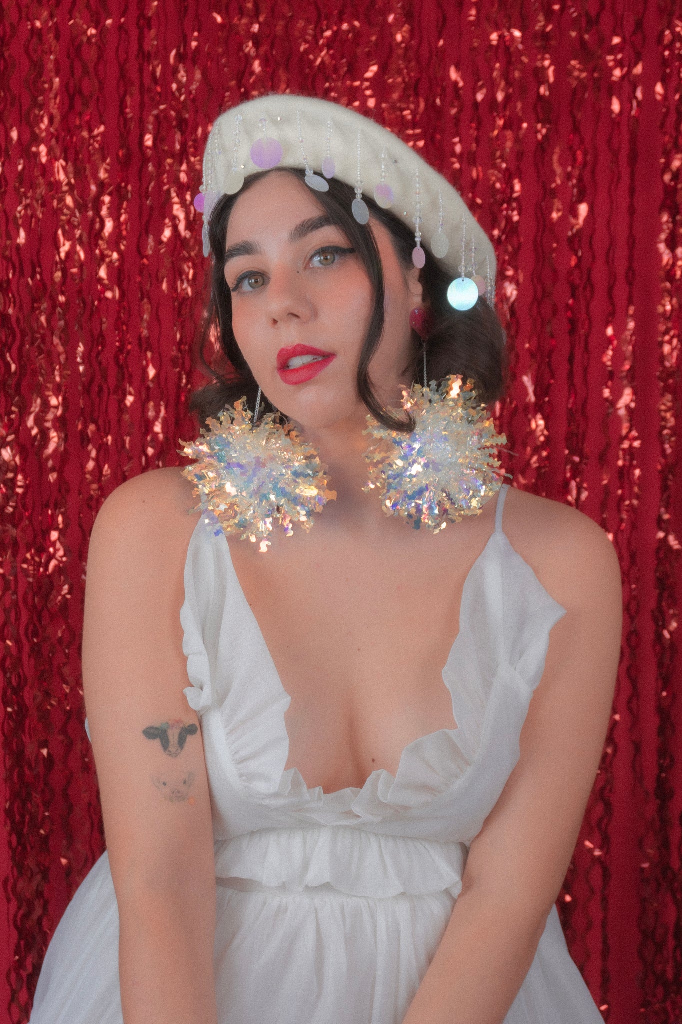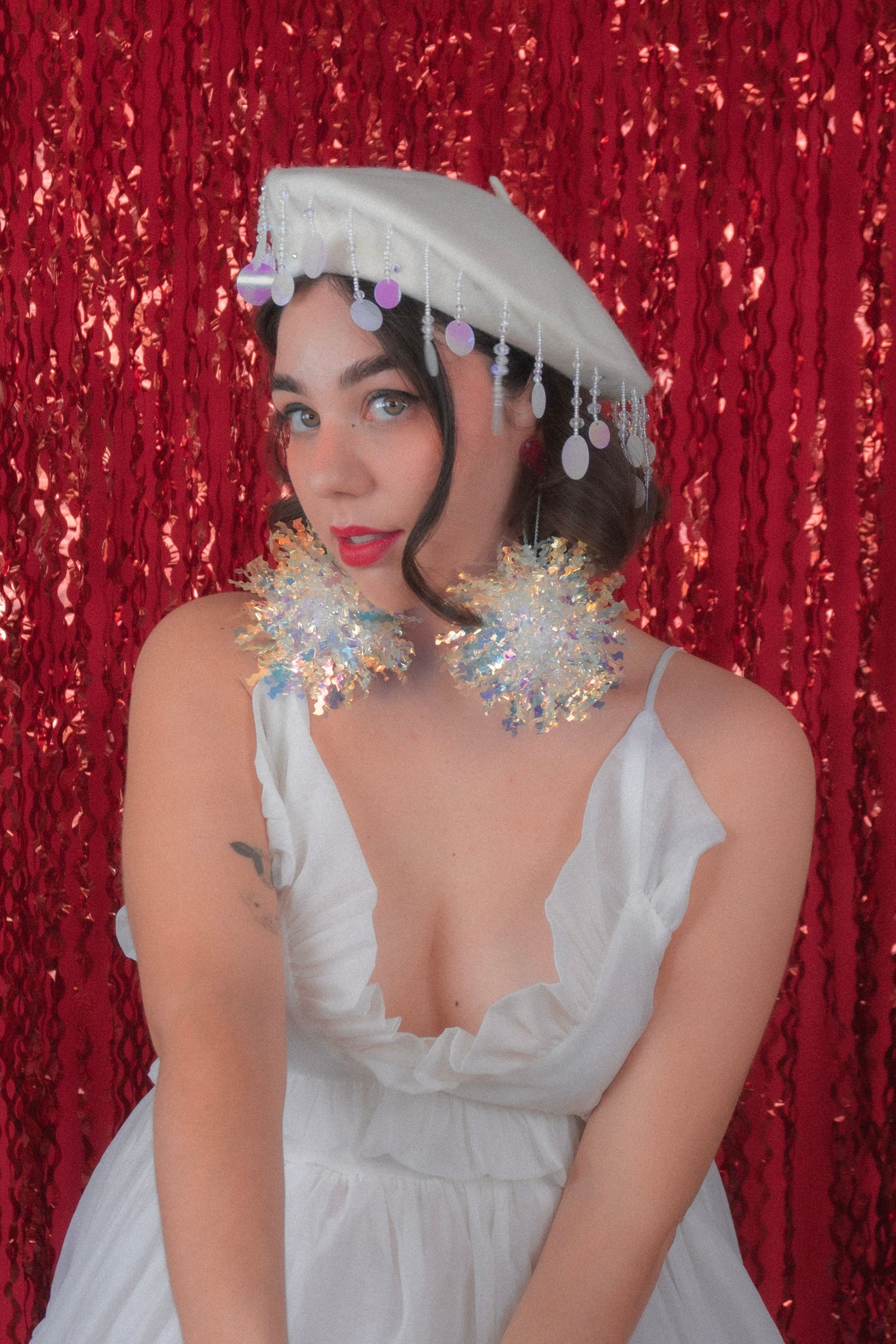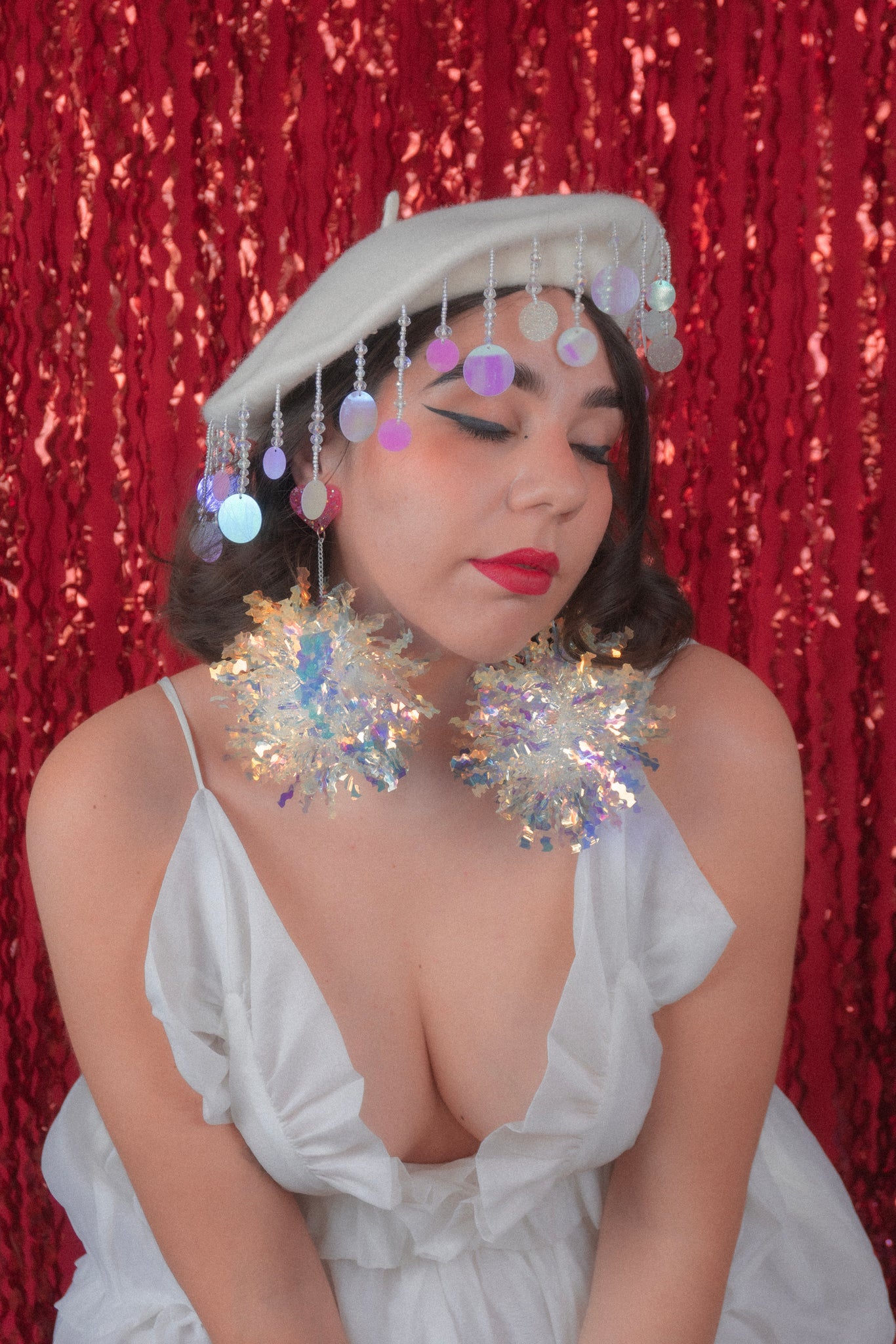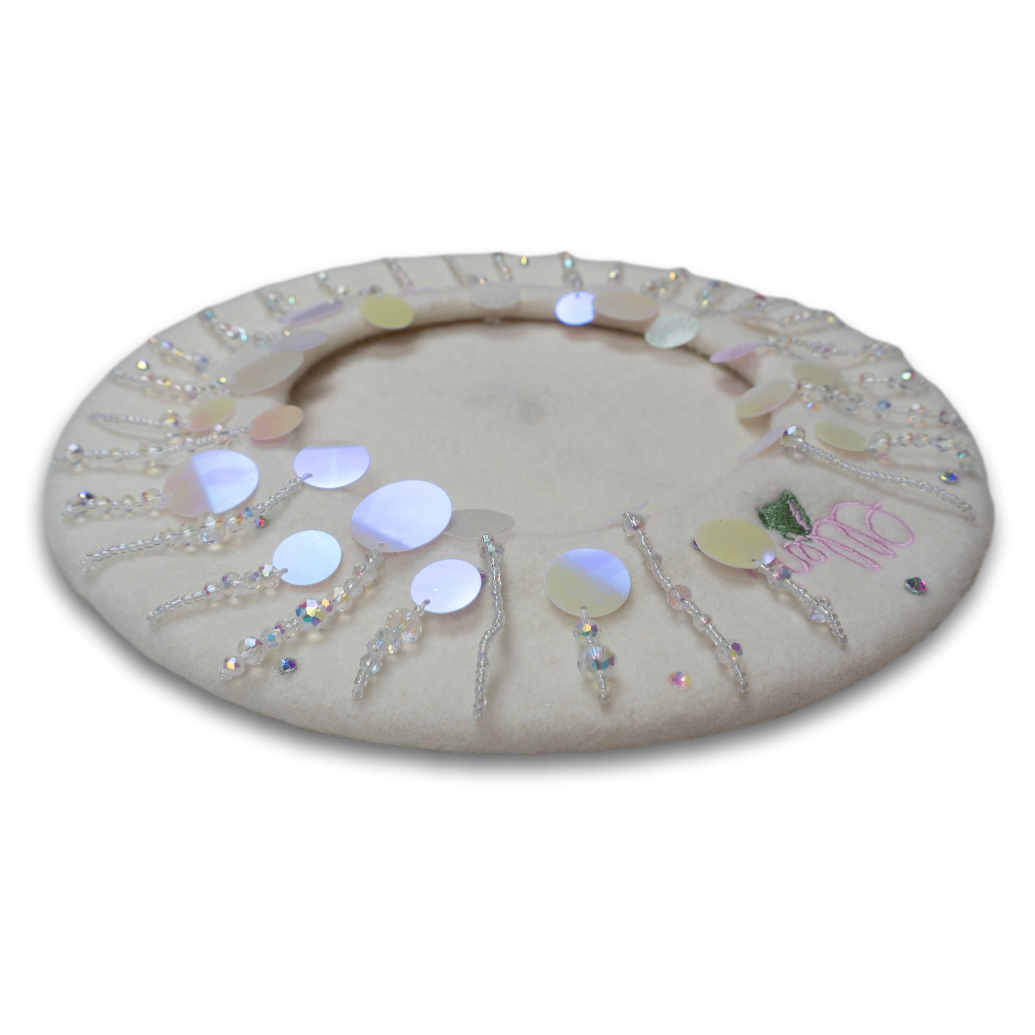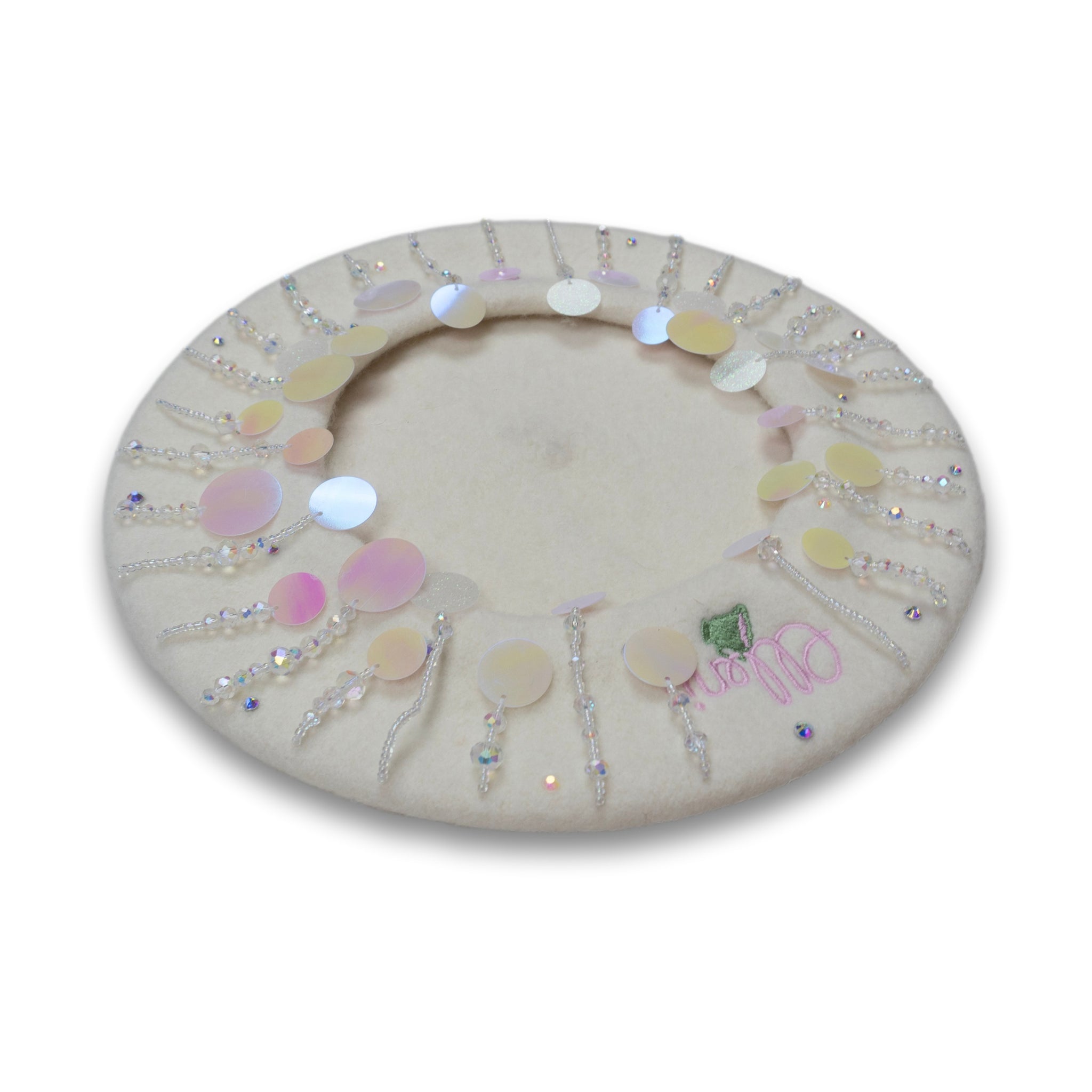 You ARE the first fall of snow this year, in the First Fall Beret. On a white beret base, two lengths of hand beaded strands alternate surrounding the entire rim, leaving only a small space for the logo. They glisten as they fall, each an array of different small clear AB beads, tipped with various sizes of reflective sequins or glitter sequins.