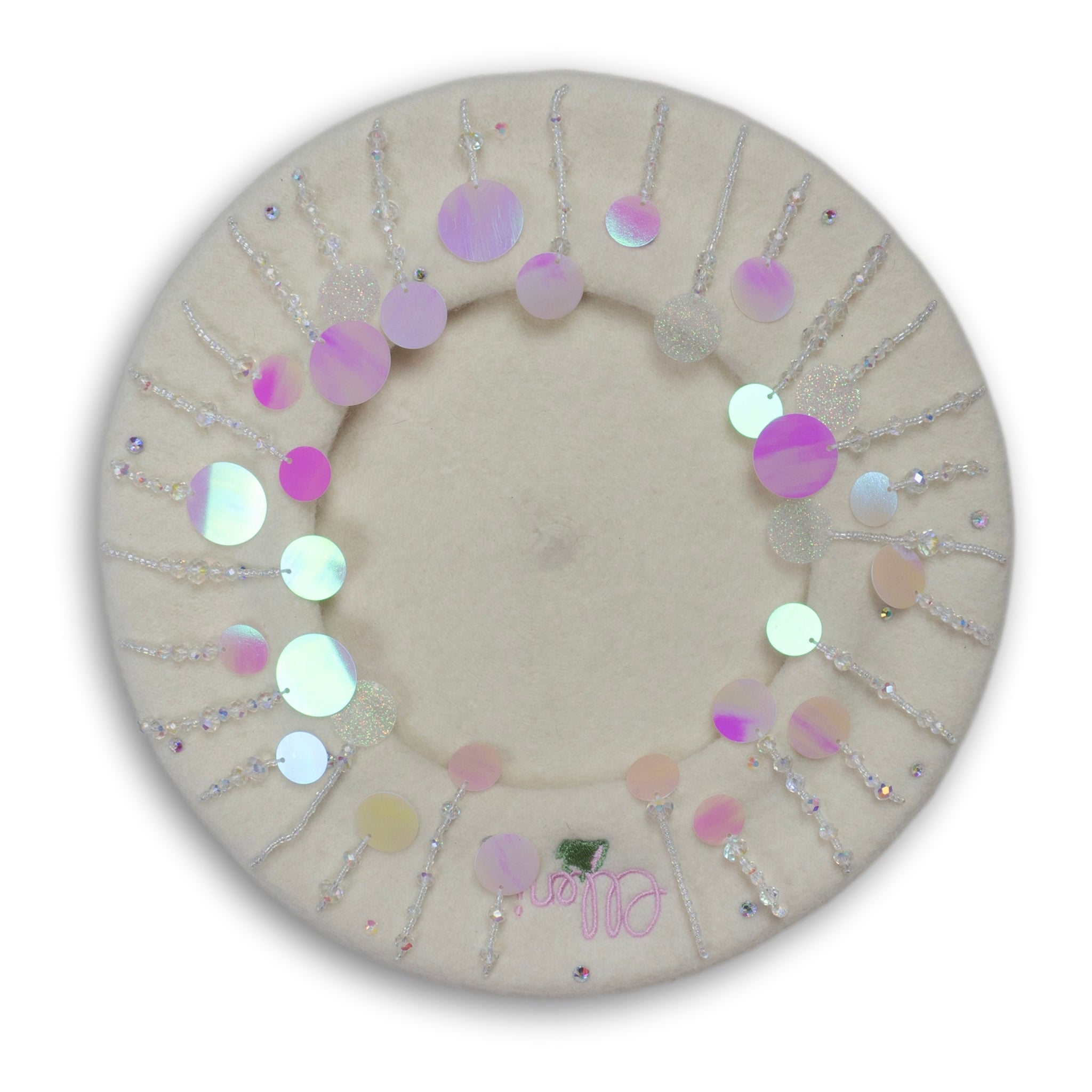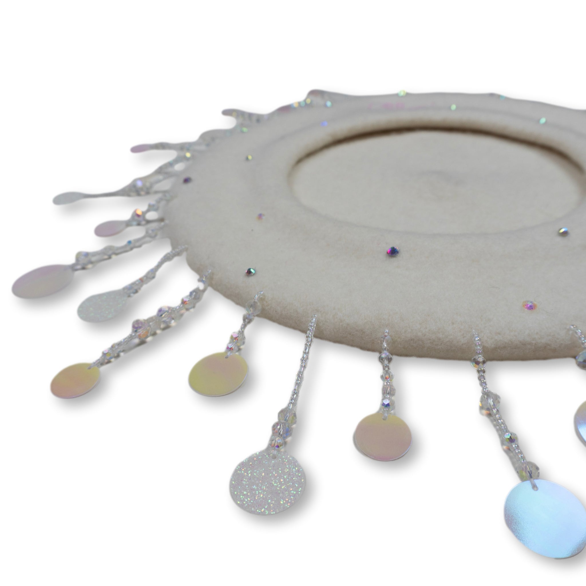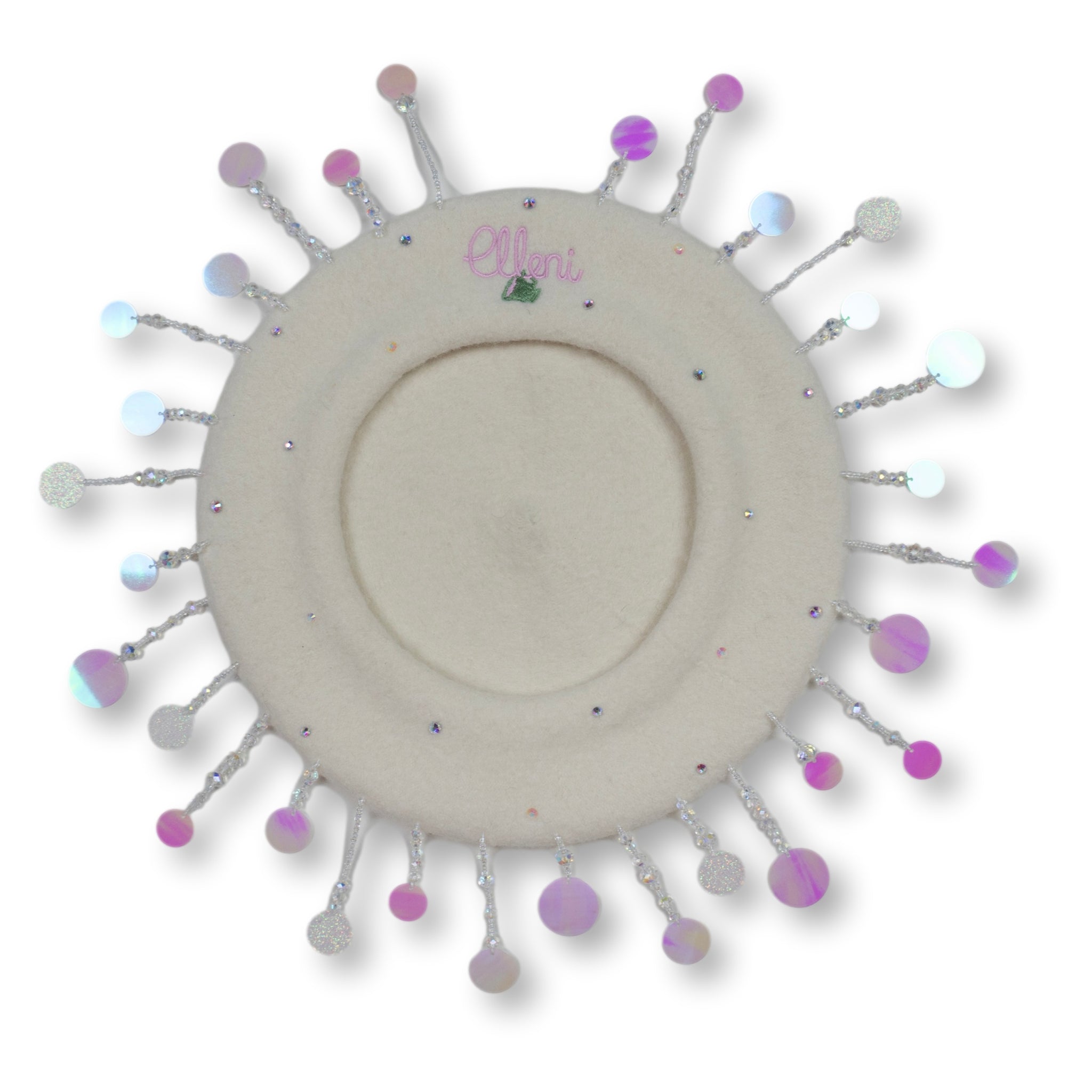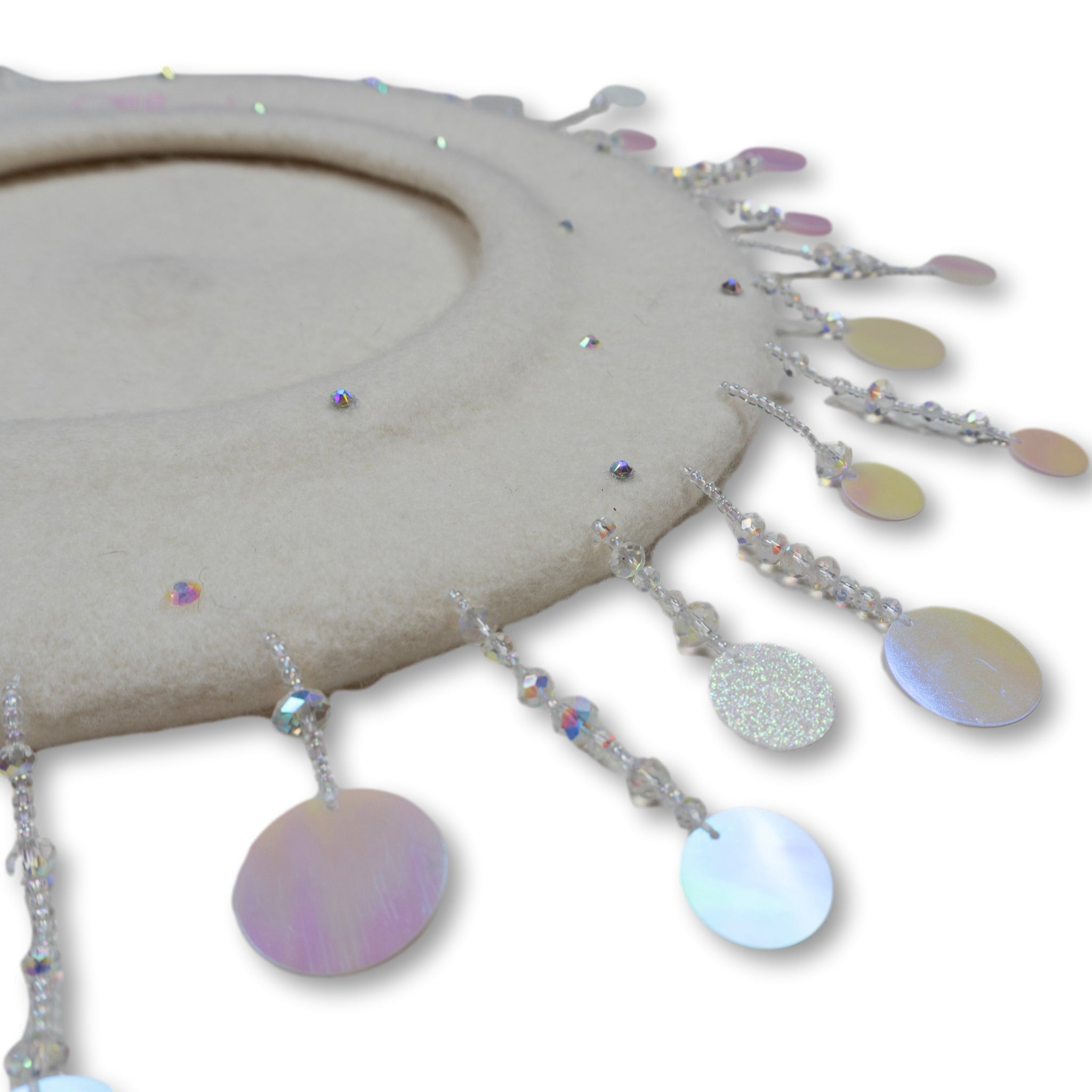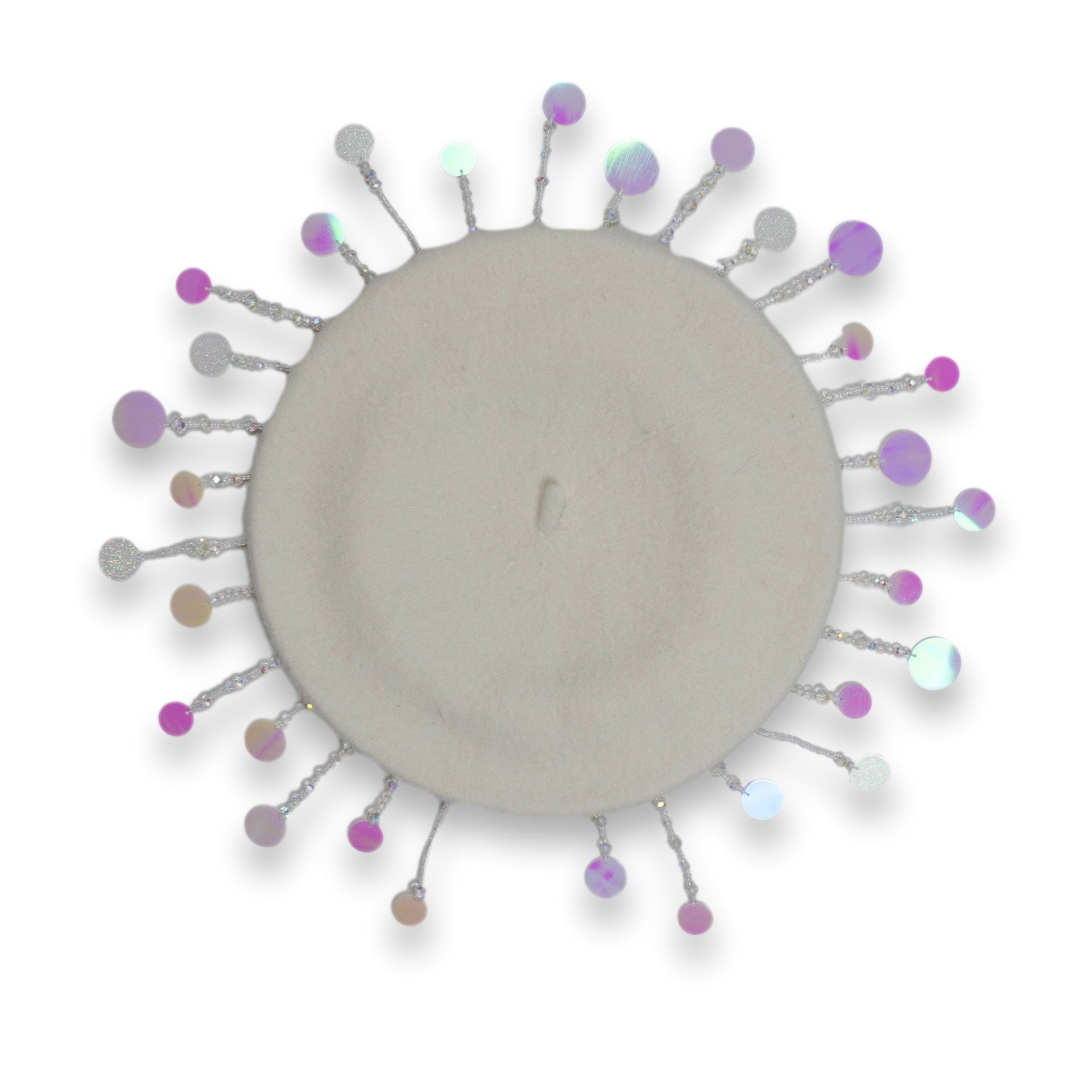 Every strand, on every beret is totally unique, much like a snowflake! All the same selection of beads are used, but the patterns will differ, with no two the same. The rim beneath the beadwork is littered with glistening rhinestones, just to ensure you're sparkling from every angle.