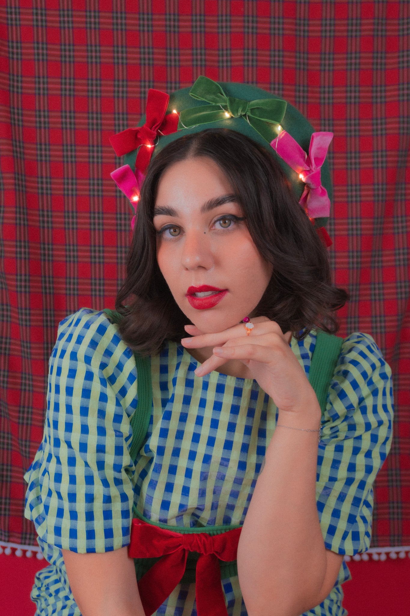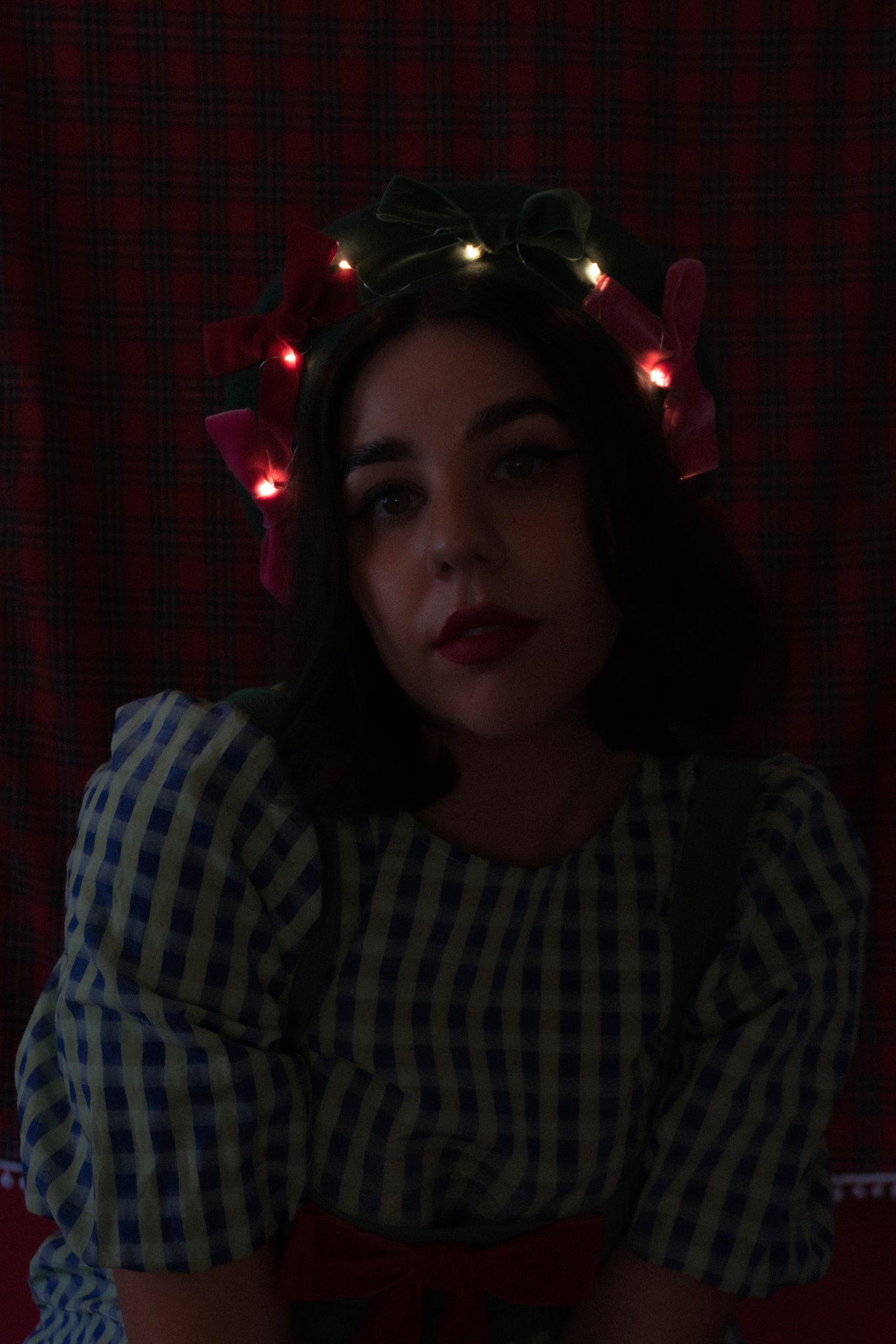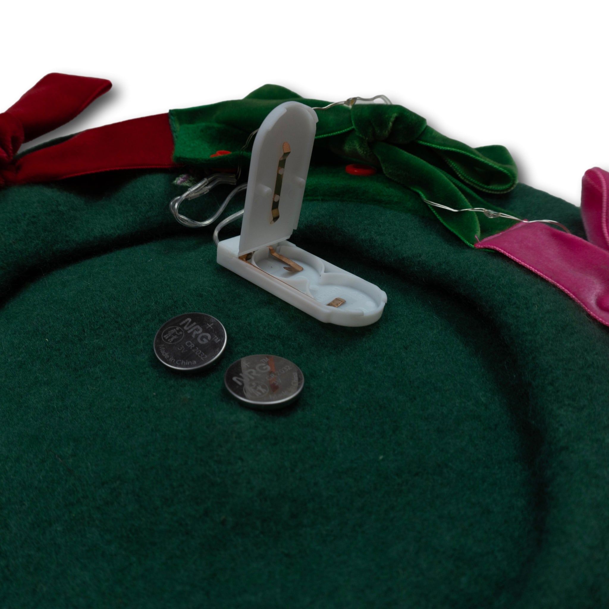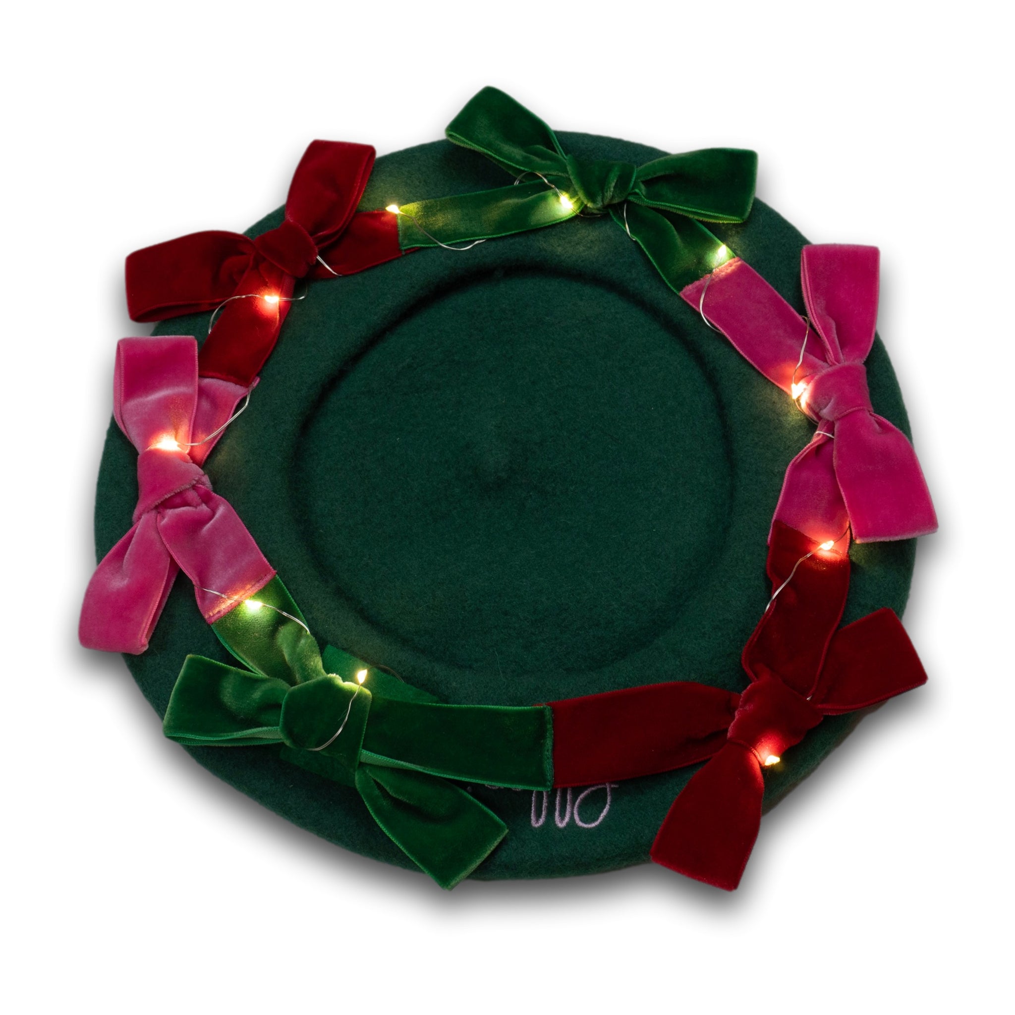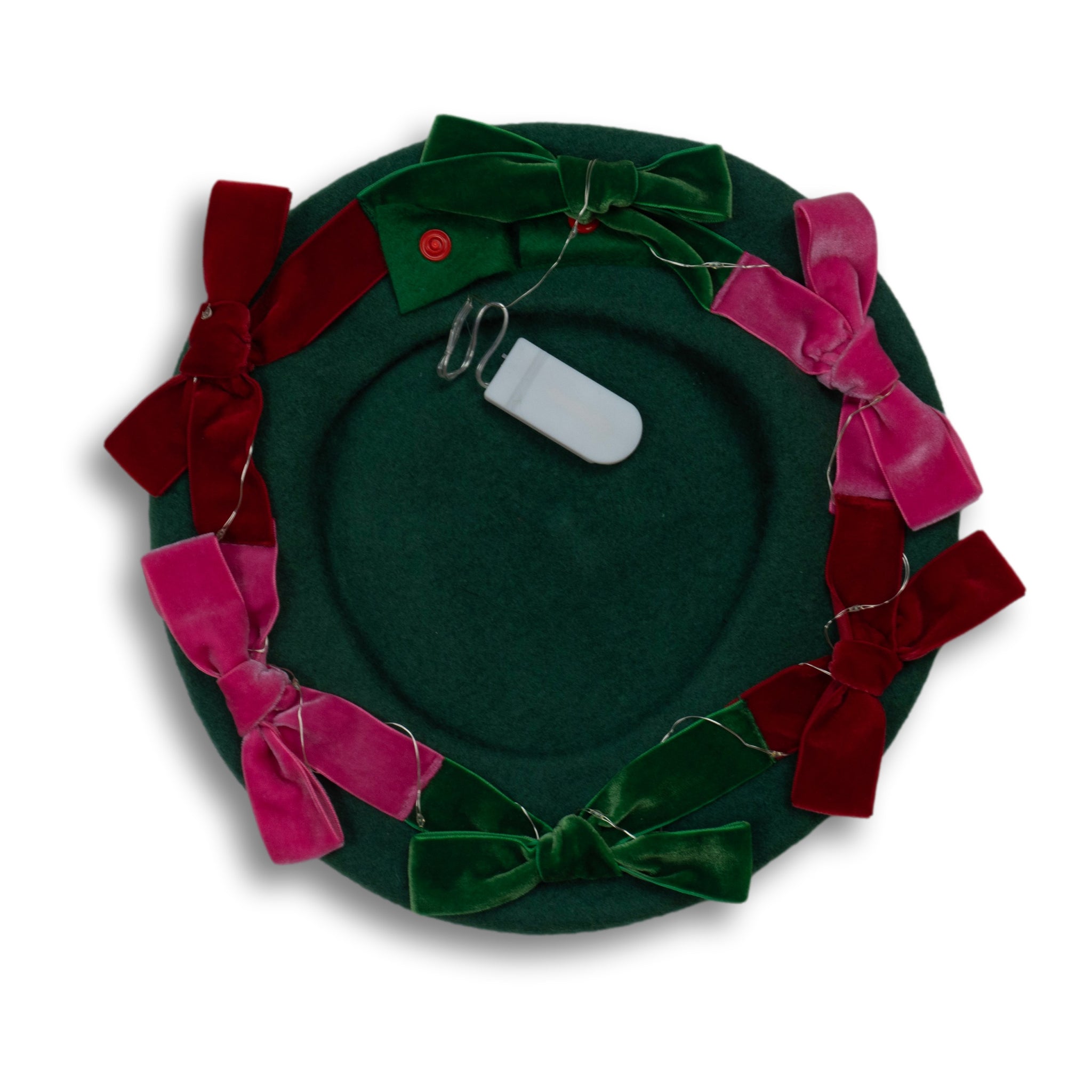 This beret is KNOT just a wreath, it's a wreath made of velvet bows - oh and it only lights up! Real fairy lights are threaded through the bows, with the battery pack securely living in a press stud closed pocket, hidden under a bow. Batteries are NOT included (they cannot be shipped) but the pack takes x2 CR2032 batteries, easily found wherever batteries are sold. The fairy lights are a warm white, and can be switched on or off.