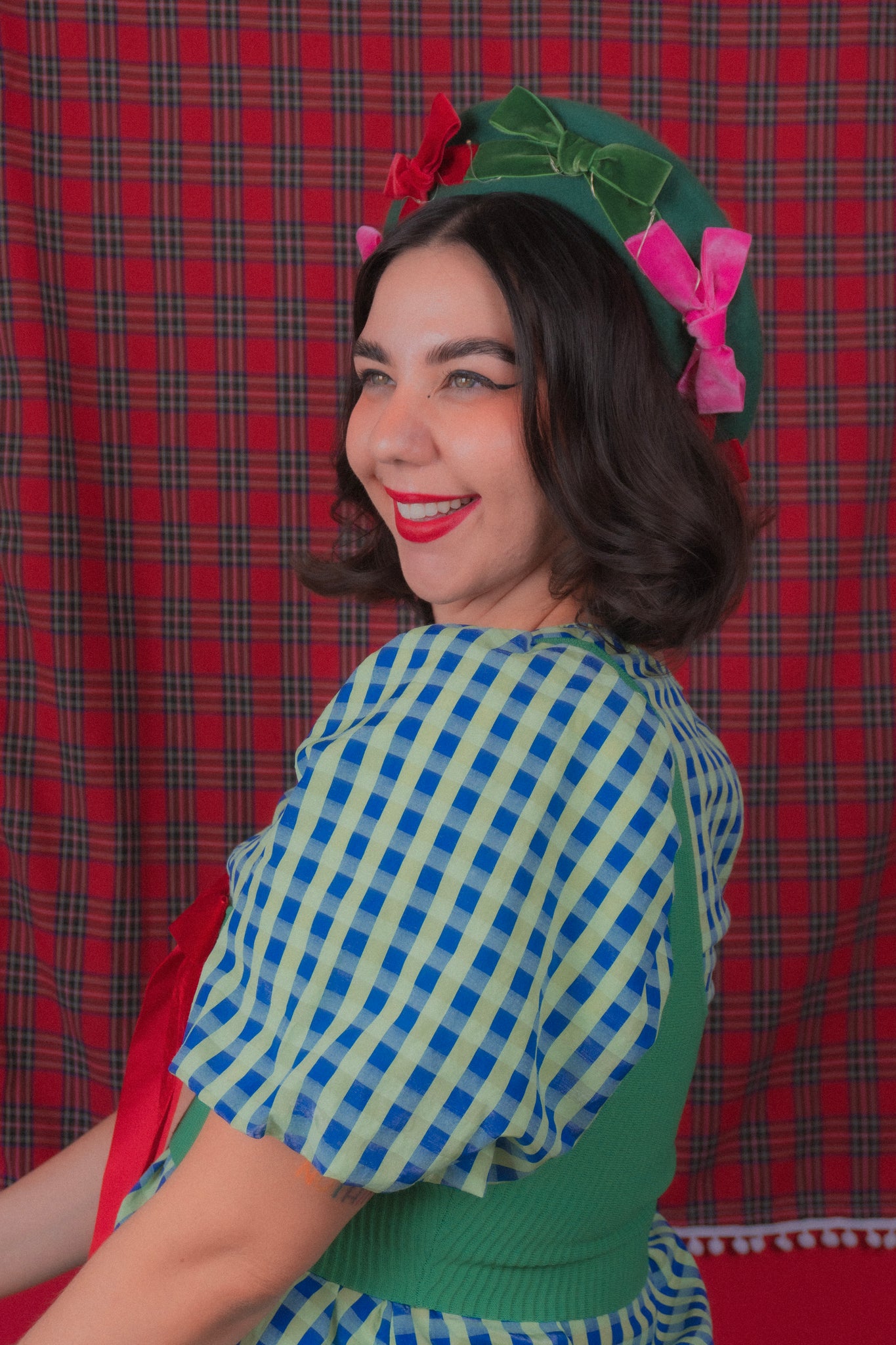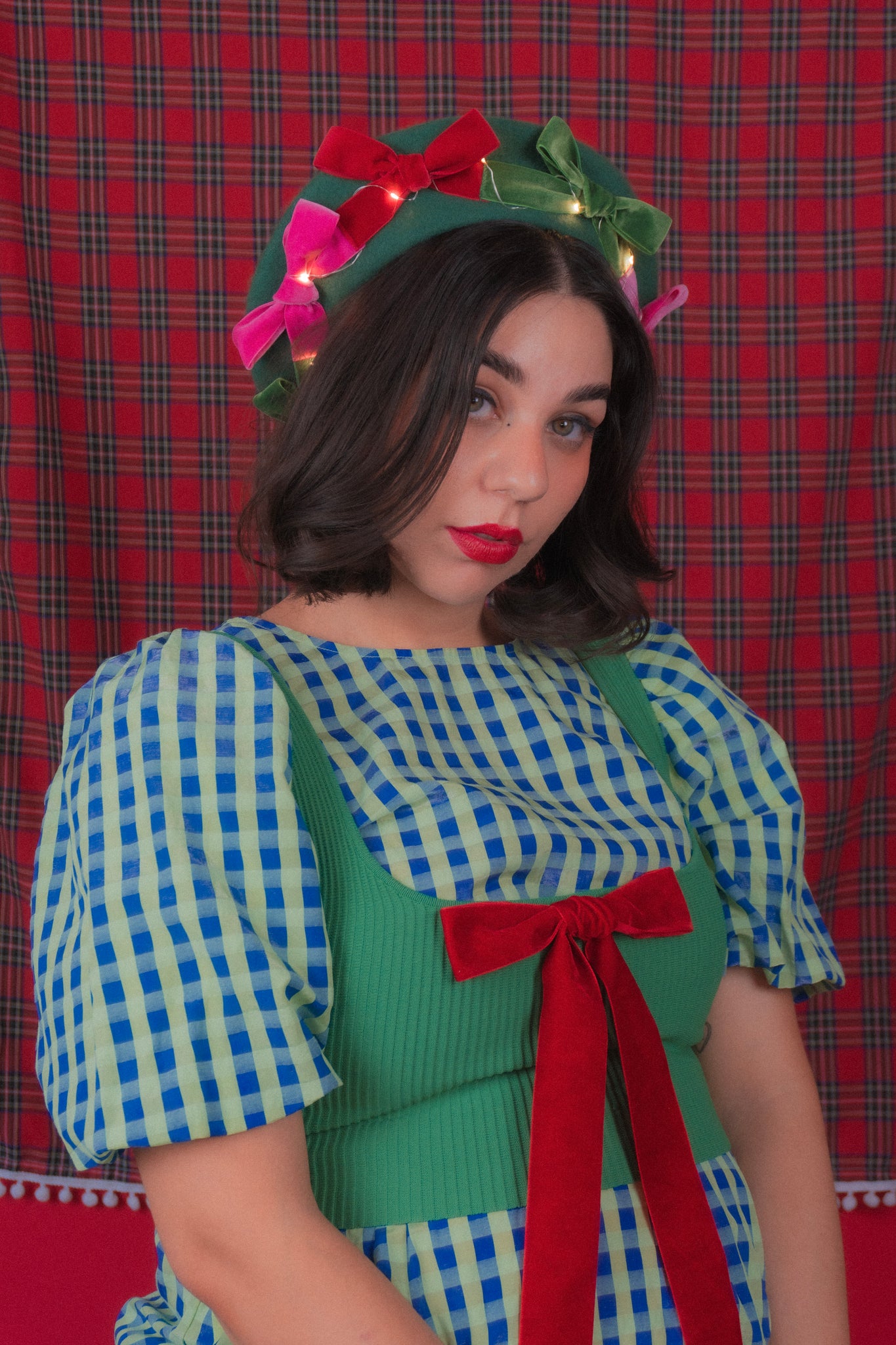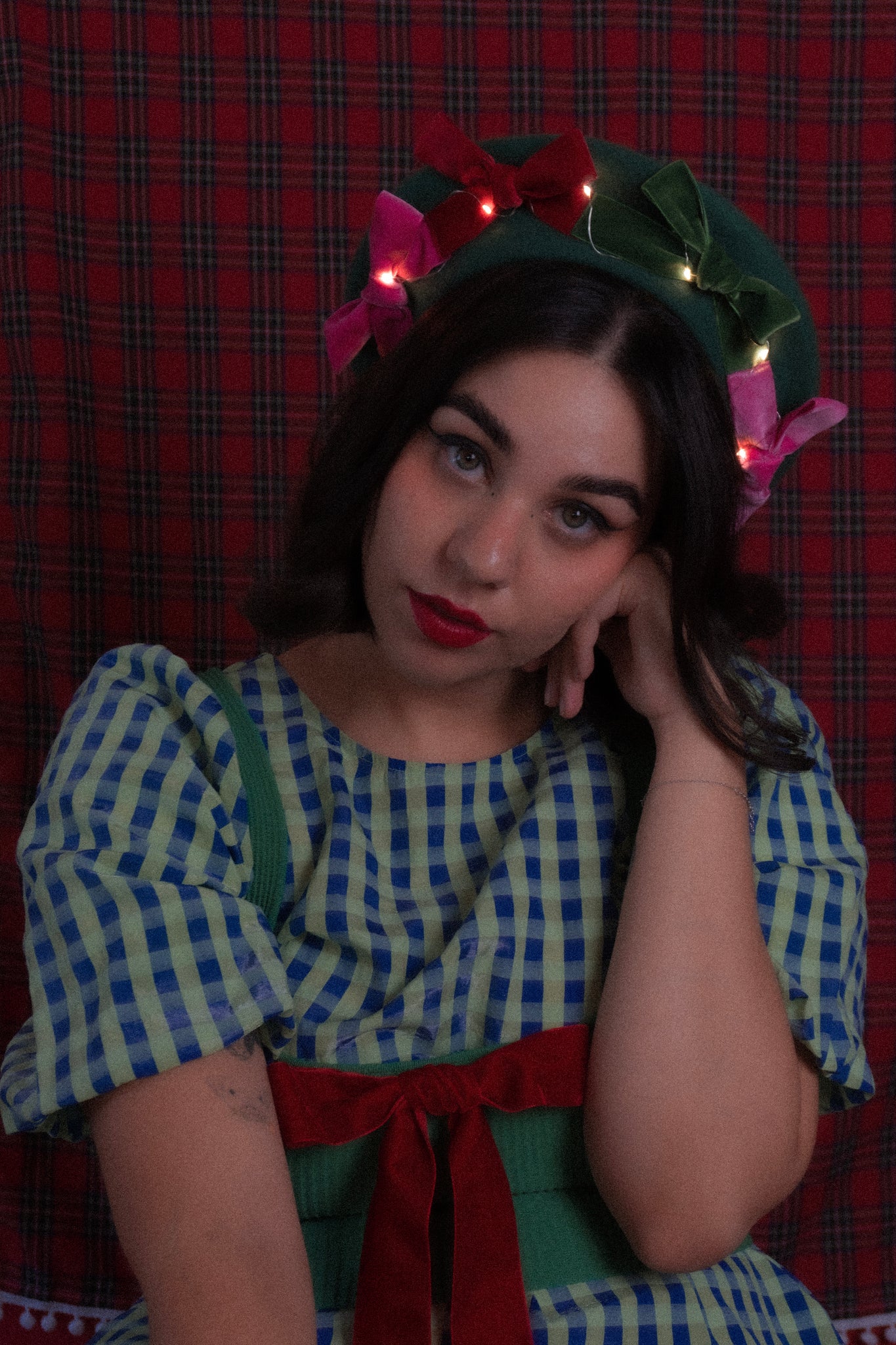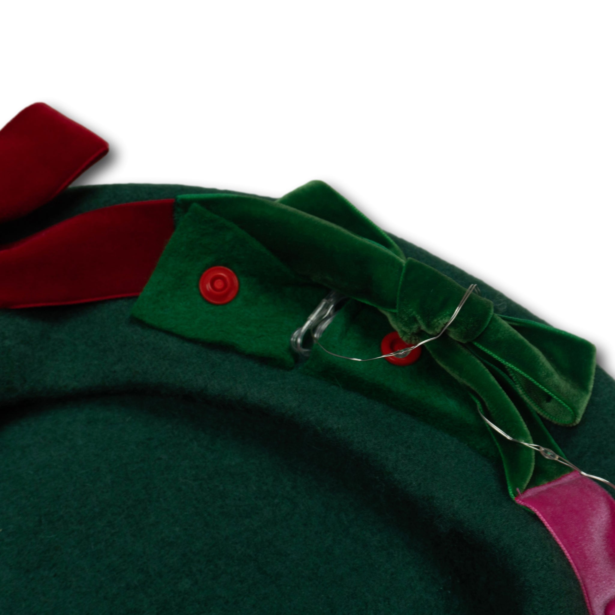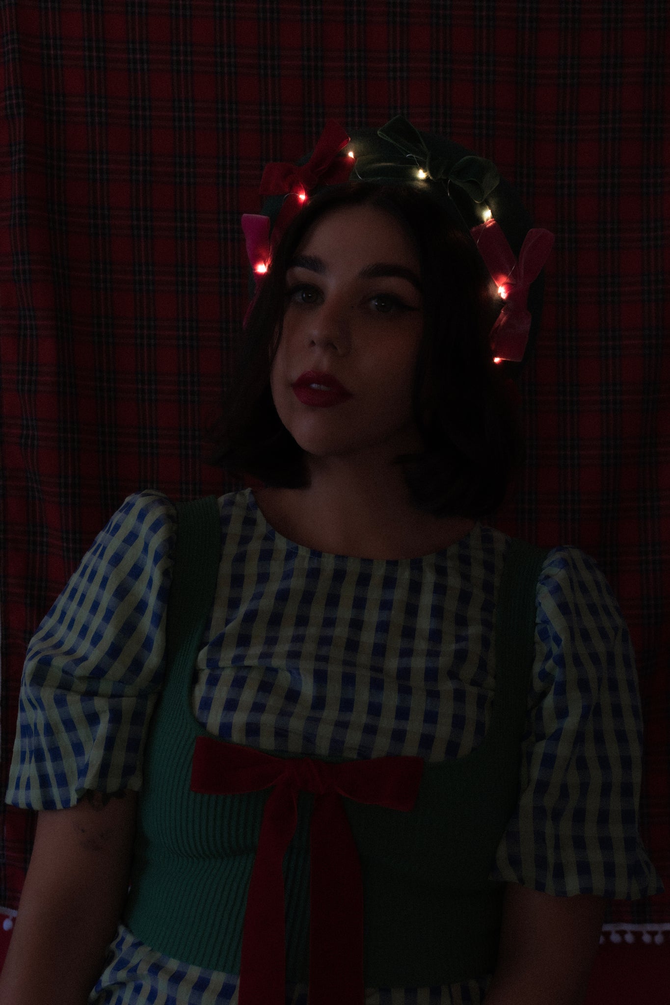 This beret is KNOT just a wreath, it's a wreath made of velvet bows - oh and it only lights up! Real fairy lights are threaded through the bows, with the battery pack securely living in a press stud closed pocket, hidden under a bow. Batteries are NOT included (they cannot be shipped) but the pack takes x2 CR2032 batteries, easily found wherever batteries are sold. The fairy lights are a warm white, and can be switched on or off.