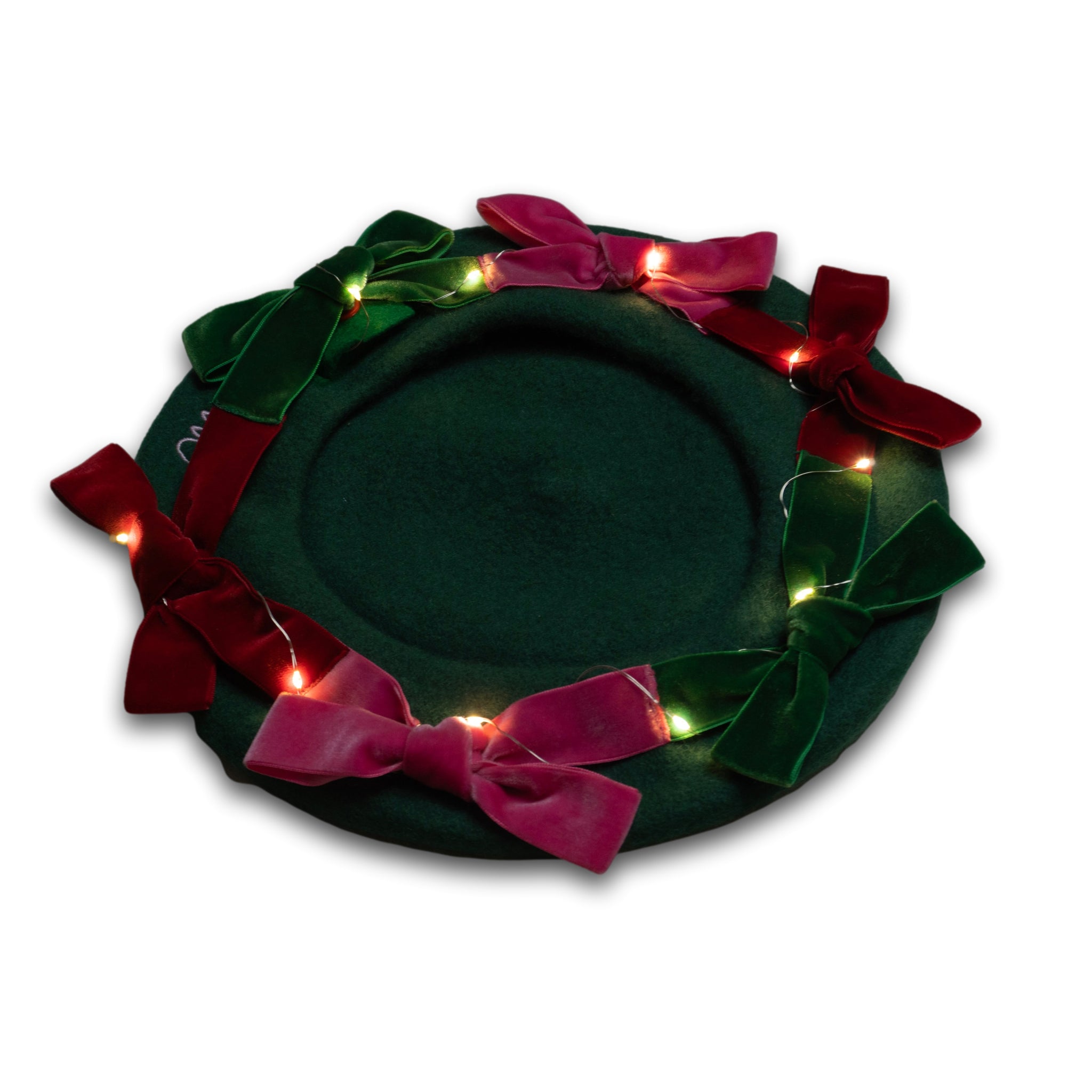 Each Knot Just a Wreath Beret is lovingly hand crafted, so may differ slightly from the one pictured. Please only spot clean and be careful in the rain. Though the lights are largely waterproof, they are still electronic - try not to get wet!