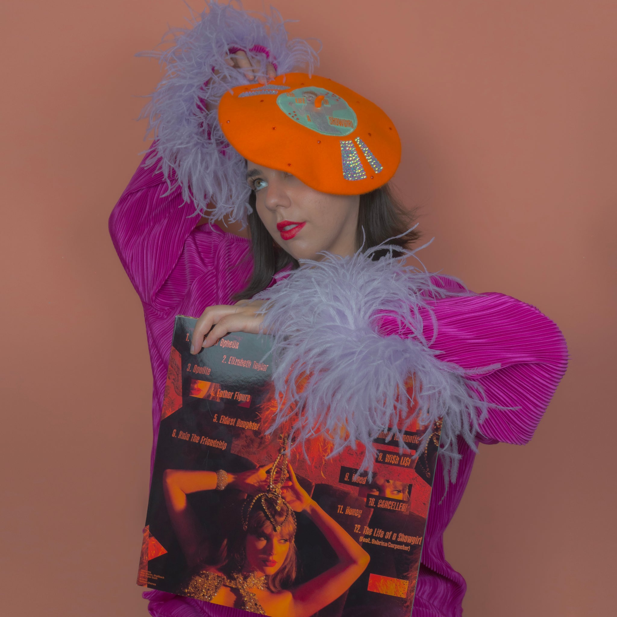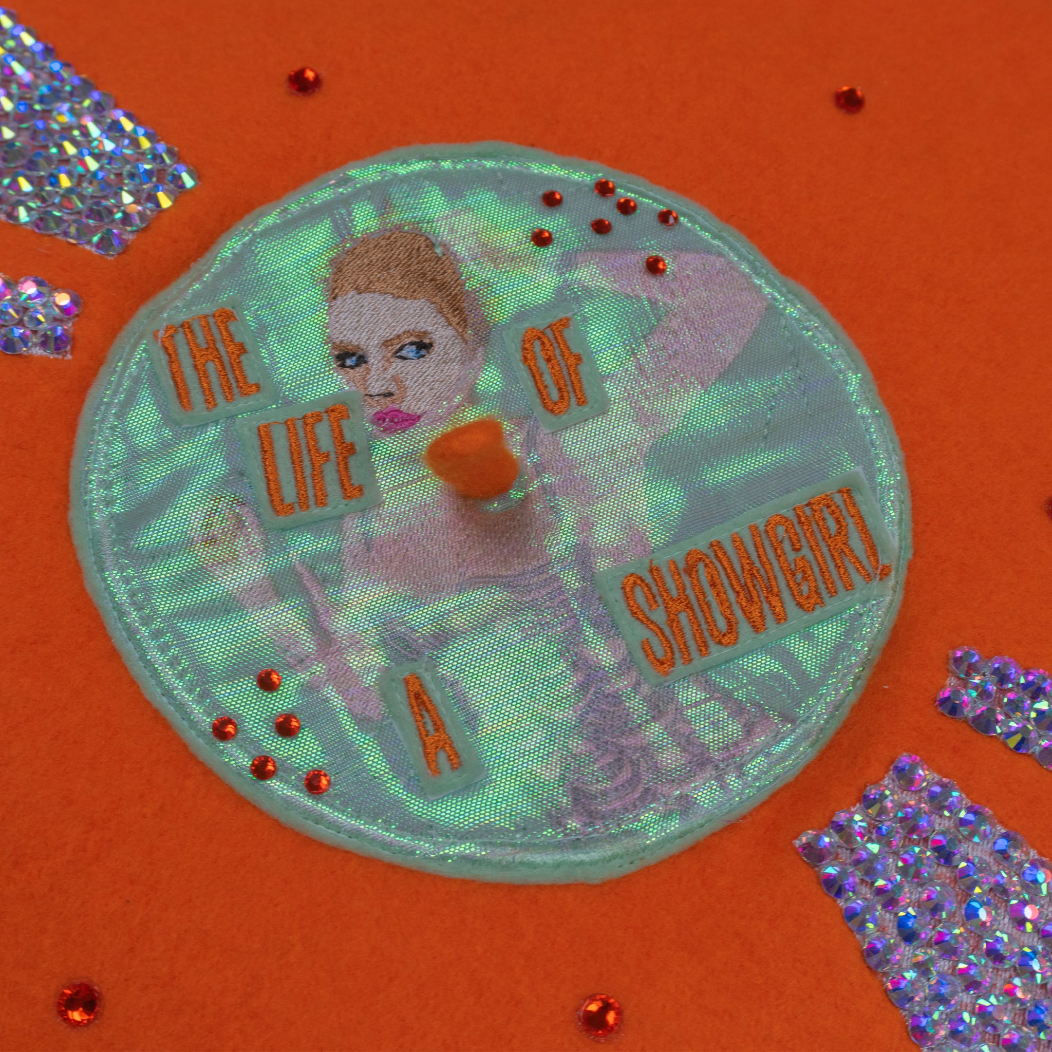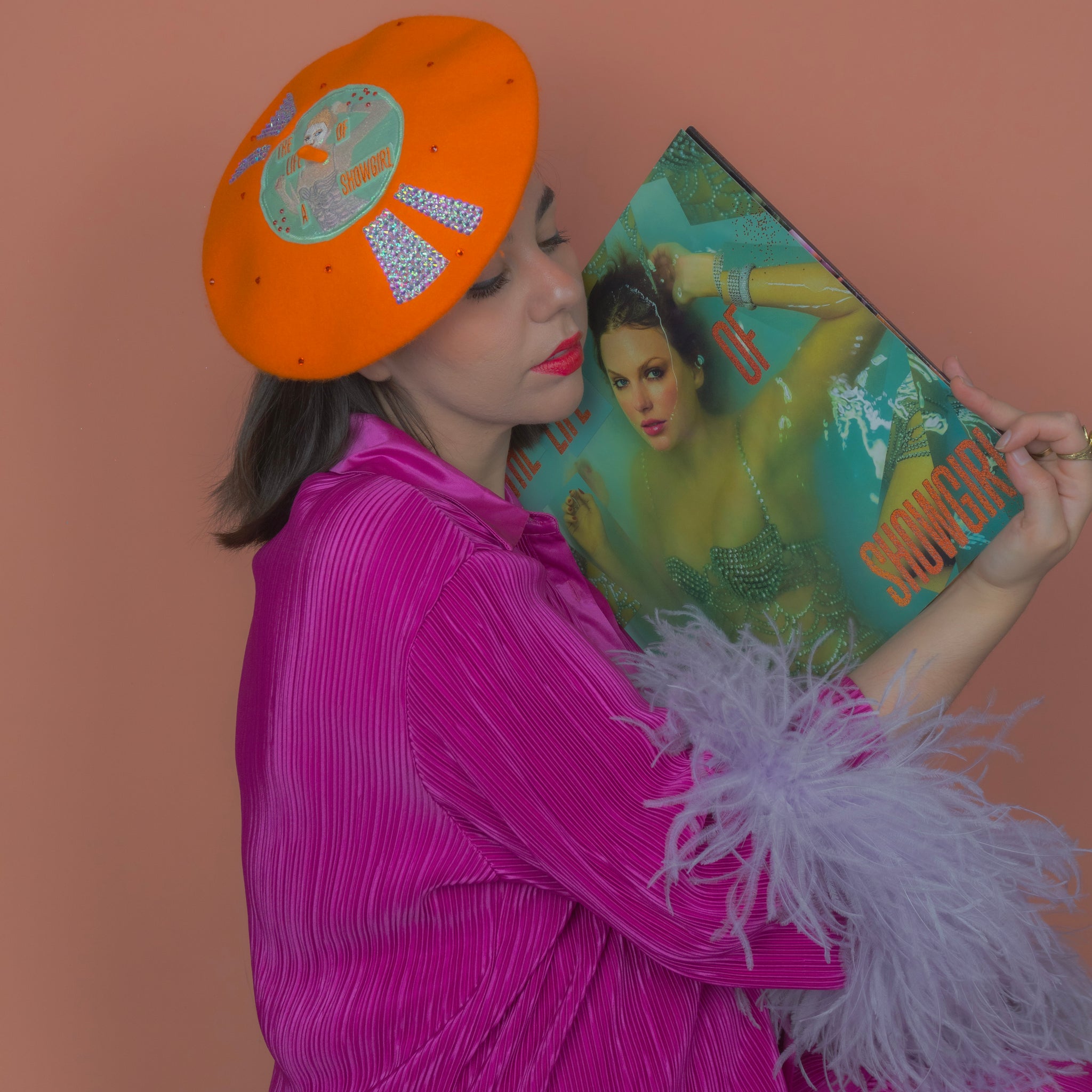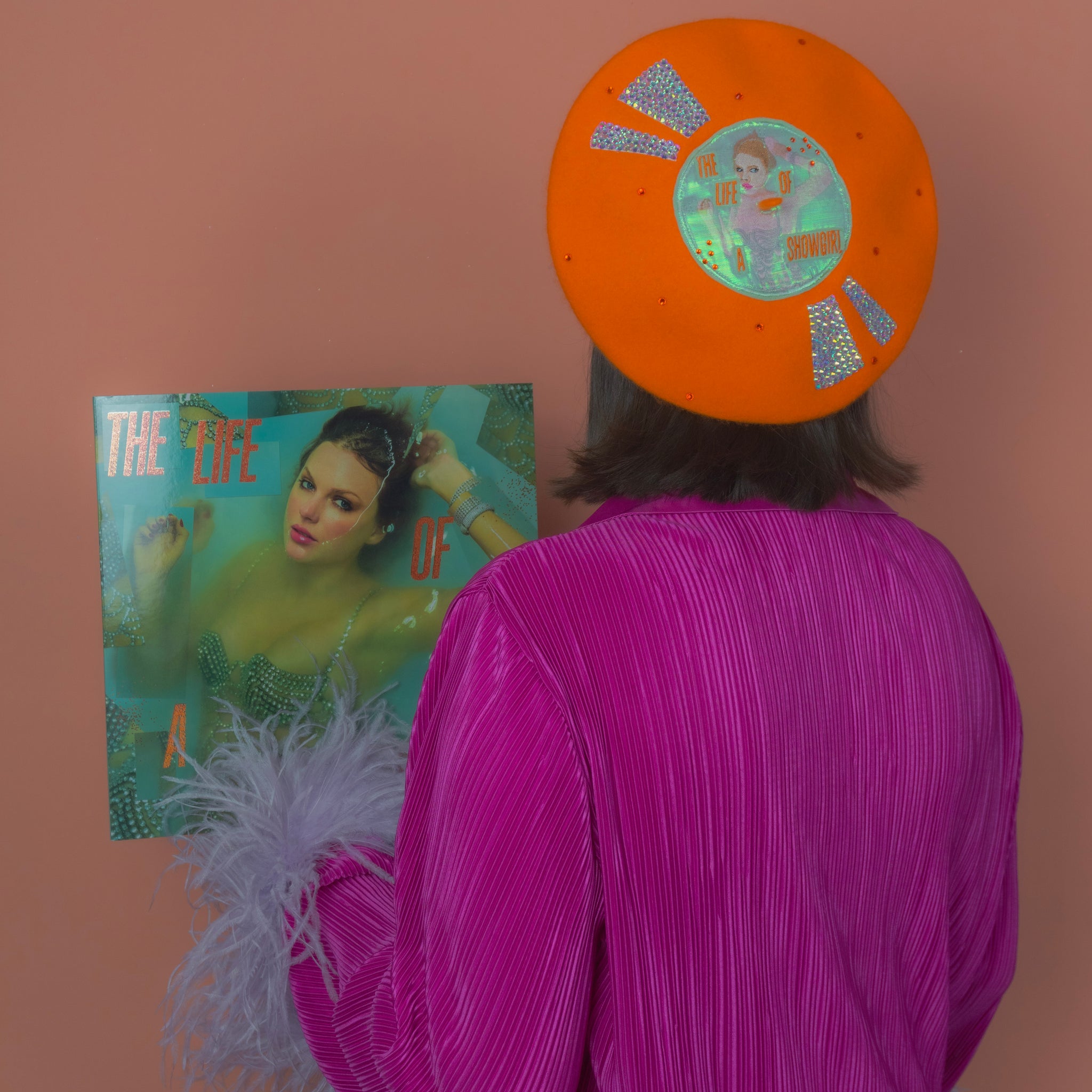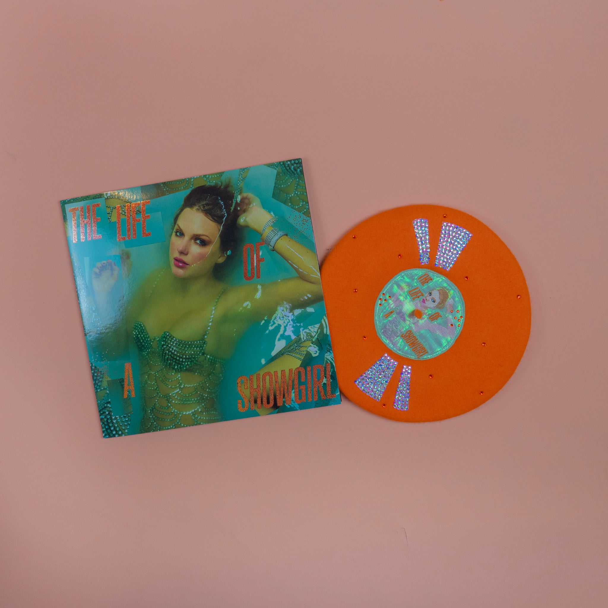 You ain't gotta Knock on Wood - The Life of a Showgirl on Vinyl Beret is here! Featuring an orange beret base with The Life of a Showgirl album cover embroidered on a teal centre. The embroidery is overlayed with shimmery organza to reflect the water, with the album title overlayed again with felt and embroidery. The beret is made Actually Romantic by reflect marks adorned with Delicate AB rhinestones as well as orange rhinestones littering the entire beret - much like the glitter of the vinyl! Got a Wi$h Li$t, or do you just want the The Life of a Showgirl on Vinyl Beret?